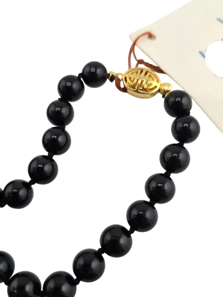Size: Around the neck is almost 30", with the horse being 2" additional. Color: Black, Gold Condition: New old stock Signed: None Details: This has the original tag, from Jean Jewels, with a description on the tag. The black beads test towards jadeite and a little past quartz. I'm not 100 percent sure on the stones, but it's past glass. The beads are exquisite, as well as the horse with its cinnabar saddle and nice fancy push-in clasp.
