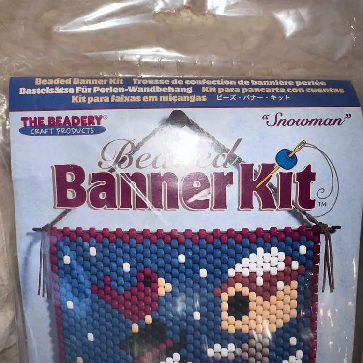 New Old Stock Vintage 2001 The Beadery Craft Products Beaded Banner Kit SNOWMAN #5186. Unopened Sealed Kit. This "Snowman" Beaded Banner Kit by The Beadery Craft Products (#5186) includes beads (blue, off-white, red), 25 yards of tan thread, 2 yards of brown cord, 2 end caps, and instructions. The kit measures approximately 9 3/4" x 14 3/4". Made in The USA. Smoke Free Home. #thebeadery #beadedbannerkit #banner #craftkit #snowman