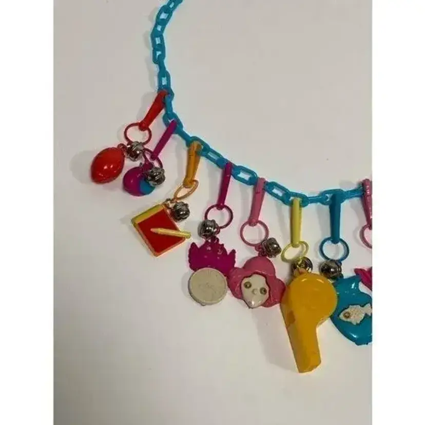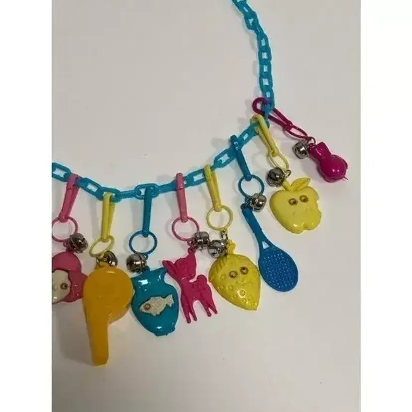 NOS New Old Stock! Deadstock! Never opened Vintage 80s Plastic Clip Bell Charms Chain Link Necklace and 12 Charms