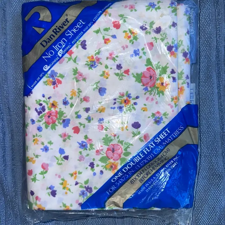 Transform your bedroom with the new old stock Vintage Dan River No Iron One Double Flat Sheet. Crafted with care in the USA, this fitted sheet combines timeless style with modern convenience. The no-iron feature ensures that you can enjoy crisp, wrinkle-free linens without the hassle of ironing, saving you valuable time. Made from high-quality materials, they provide luxurious softness and durability that will enhance your sleep experience. With a vintage design, these pillowcases add a touch of nostalgia to any décor while providing comfort and functionality. Perfect for those who value both aesthetics and practicality, this set is a must-have for your bedding collection. Don’t miss out on this opportunity to elevate your bedroom. Smoke Free Home.