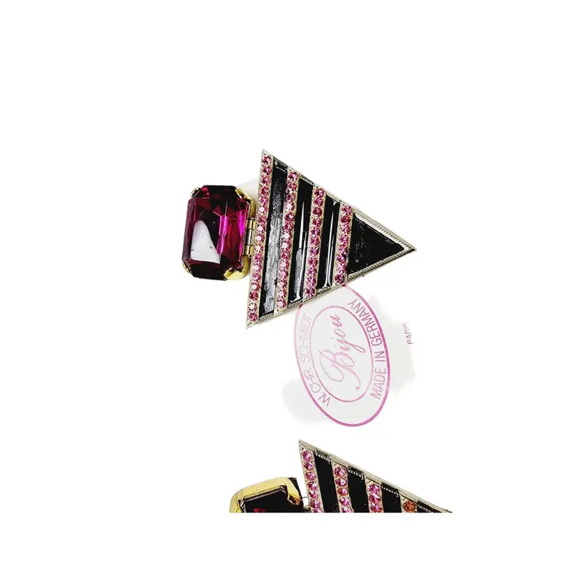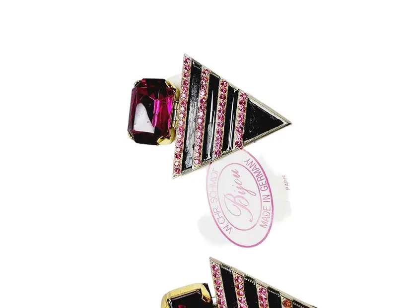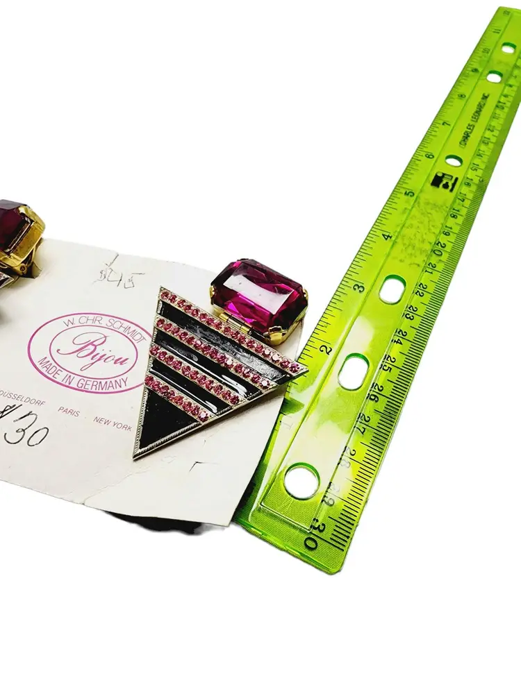 Fabulous pair of vintage clip earrings featuring a beautiful purple stone base, attached is an inverted triangle in black enamel and purple rhinestones. Made in Germany and still in its original box. Some stones have been replaced and enamel has been touched up.