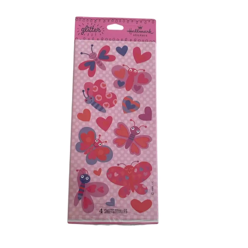 New old stock Hallmark package of stickers with glittery pink butterflies. Each package contains 4 sheets. Made in the USA.
