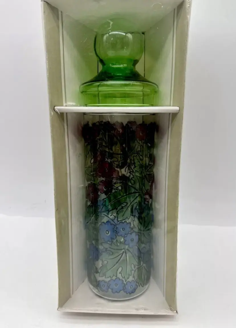 The jar is beautifully decorated with a floral pattern and is a great addition to any vintage or retro-style home. It comes with its original packaging and is in excellent condition. This set includes two items - the apothecary jar and its lid. Don't miss out on this unique vintage find!