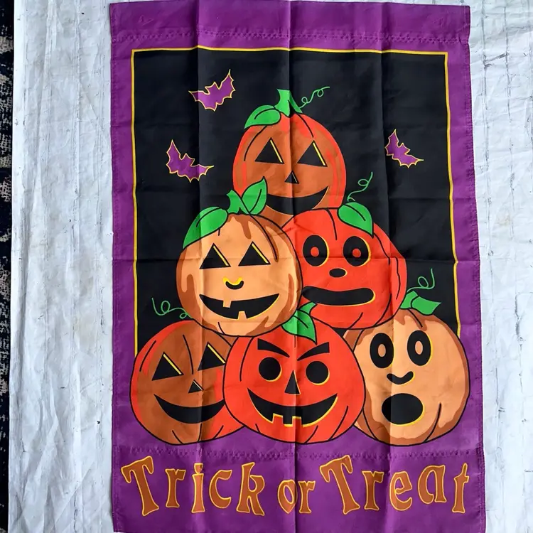 New Old Stock Vintage UNUSED Halloween Jack-O-Lantern Pumpkin Outdoor Yard Flag 41 x 29. Single Stitch. In Original Packaging. Flag Does Have Some Fading (minimal) At Fold Lines From Many Years Of Storage. Other Than Minimal Fading On Fold Lines The Flag’S Colors Are Bold And Bright. Great Seasonal Home Decor Item. Smoke Free Home. #gardenflag #houseflag #halloween #jackolantern #pumkin