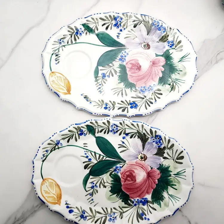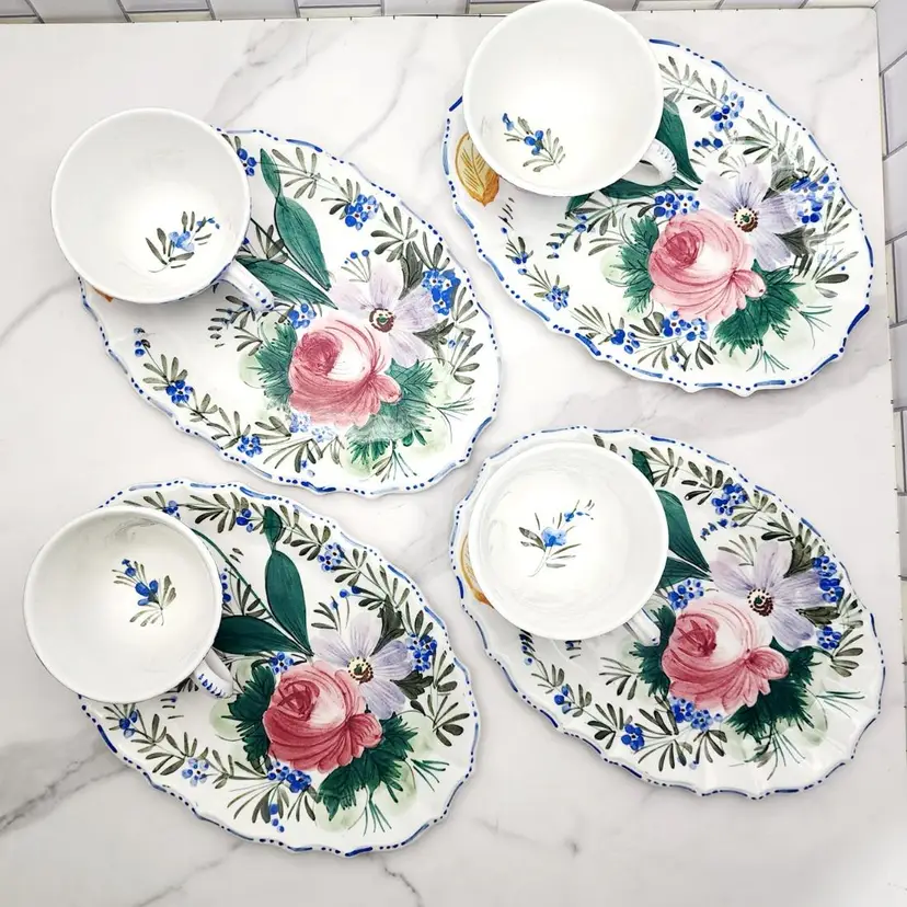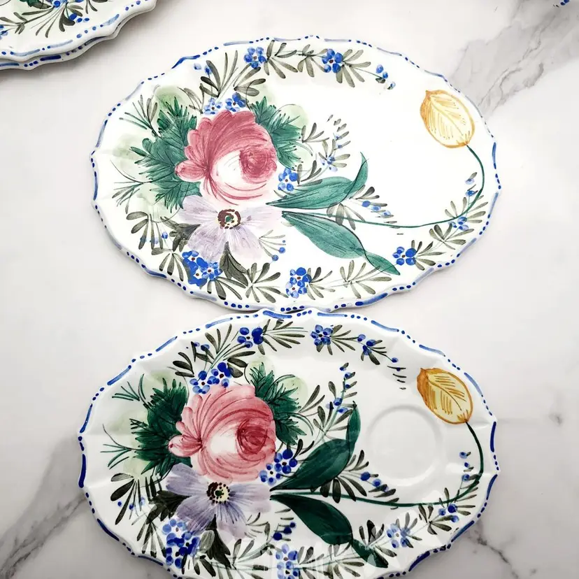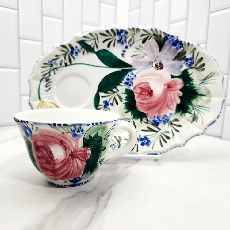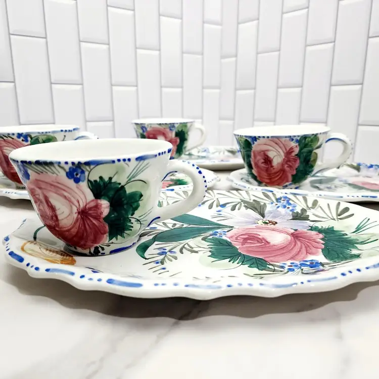 Vintage oval snack plates with cups. Handpainted with Pink, Purple & Blue Flowers in Italy each is slightly different. Plates are 10in by 7in. Cup 7oz to the rim. Pattern: Nove Rose Made by: Italy Condition: Pre-owned. Excellent condtion. No Chips, Cracks or Crazing.
