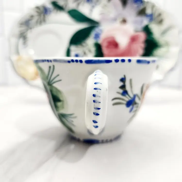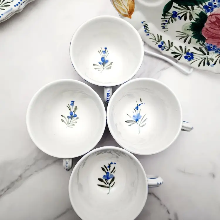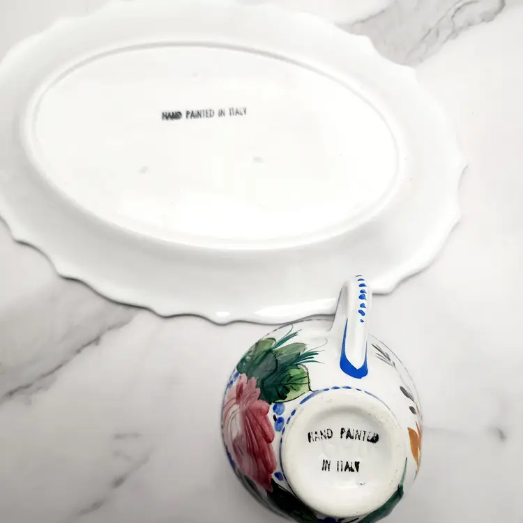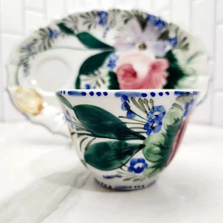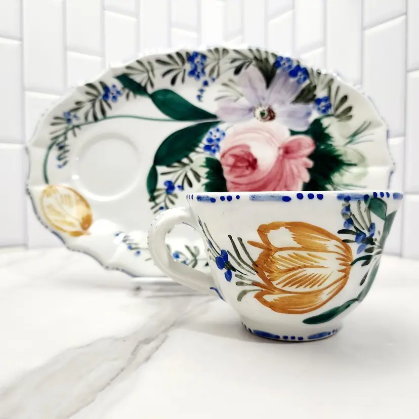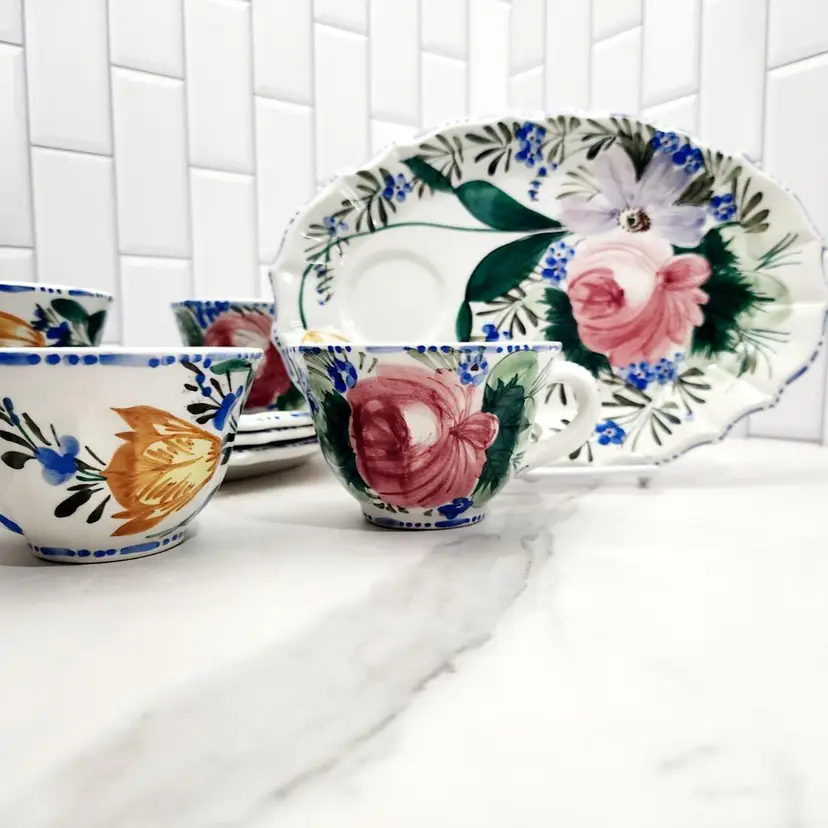Vintage oval snack plates with cups. Handpainted with Pink, Purple & Blue Flowers in Italy each is slightly different. Plates are 10in by 7in. Cup 7oz to the rim. Pattern: Nove Rose Made by: Italy Condition: Pre-owned. Excellent condtion. No Chips, Cracks or Crazing.