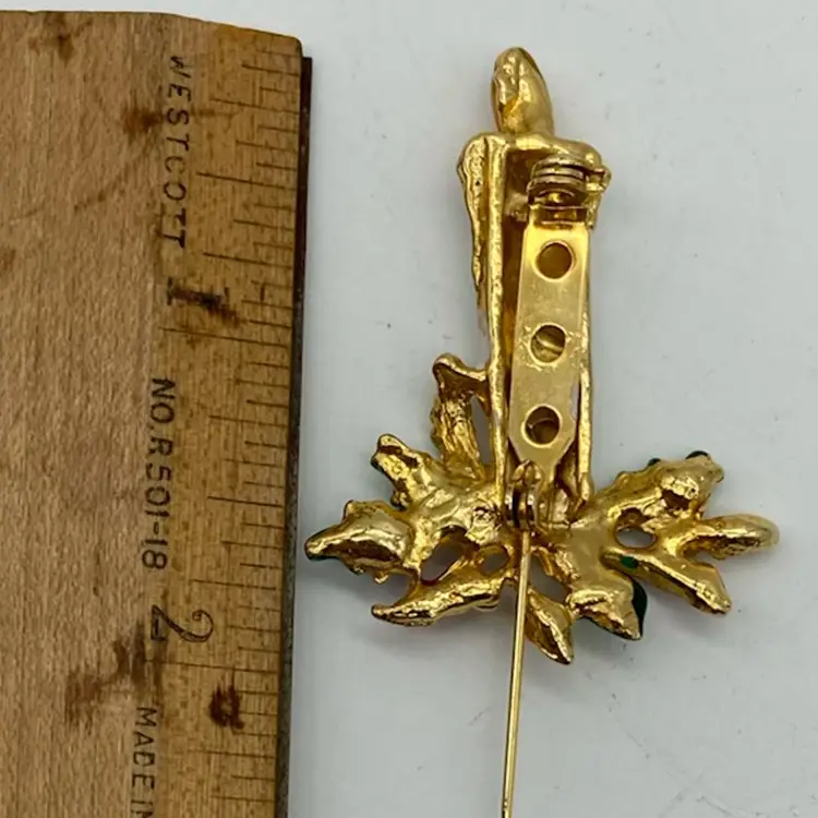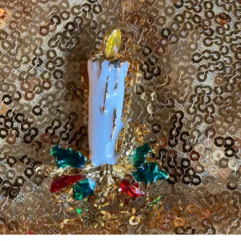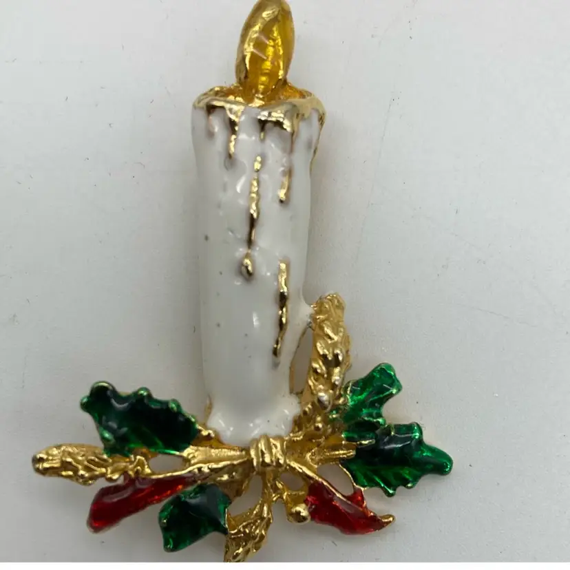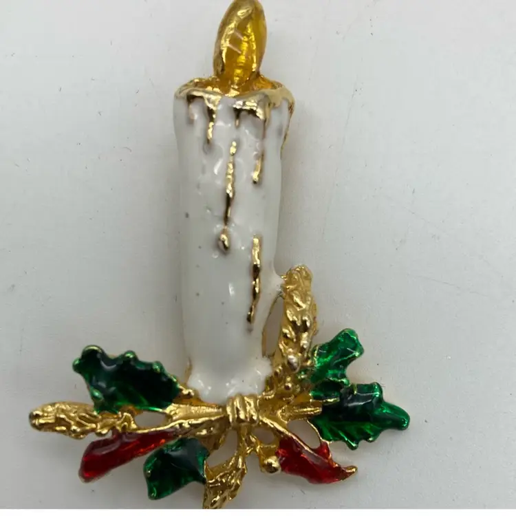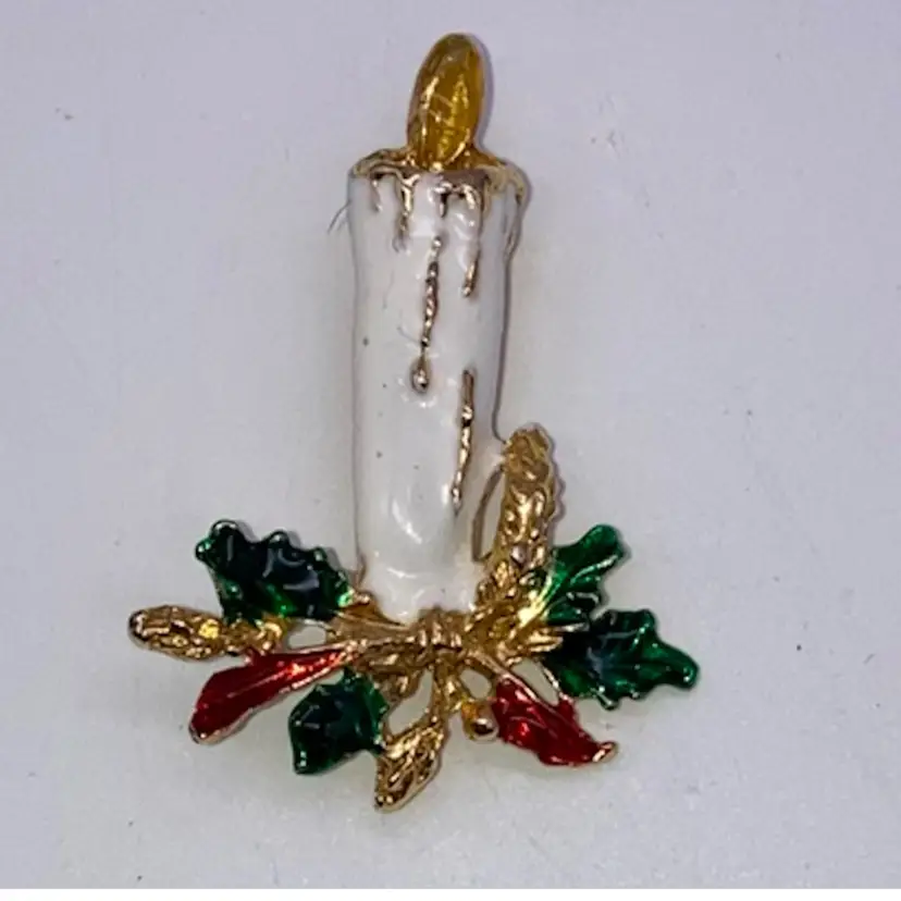 Christmas candle pin brooch is in great used condition. Bright gold-tone with good C-clasp. Unmarked.