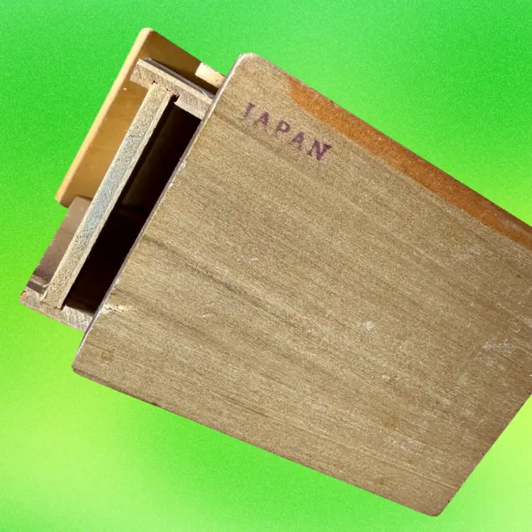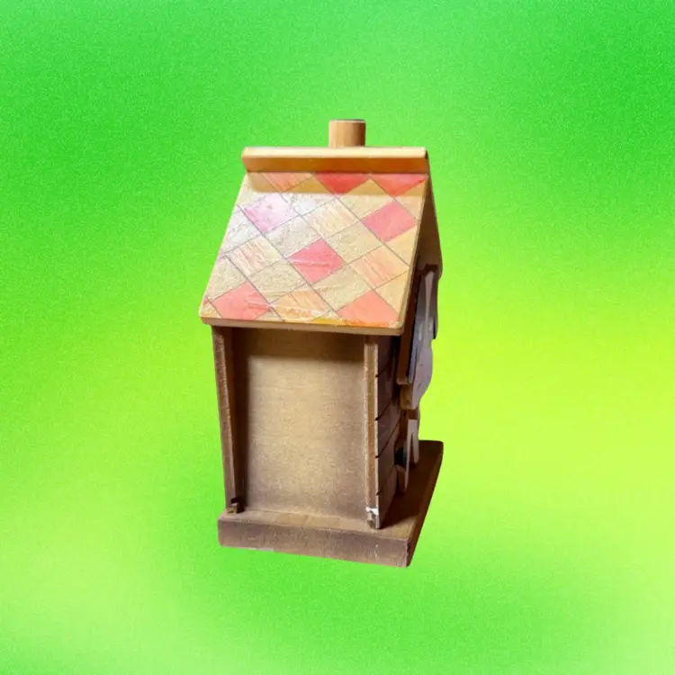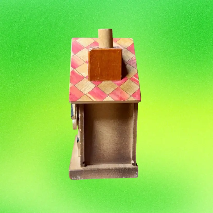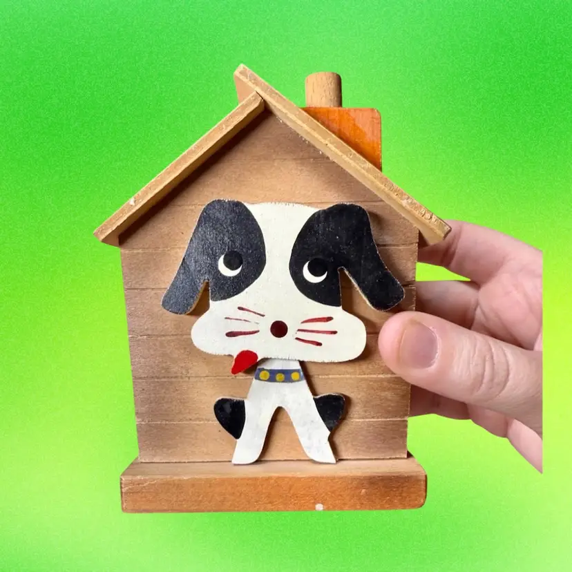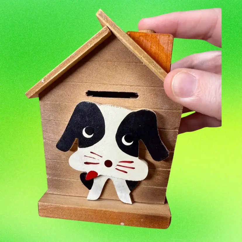 3.25”x2.5”x4.75”. Such a fun coin bank! Dog sitting in his dog house - when you press the knob on the chimney, the dog moves down and the coin slot is revealed. A strong squeak (similar to a dog toy sound) is made when knob is pressed, as well. To retrieve the coins, you push the house to the side to reveal an open space underneath (see picture). Great condition overall - only call-outs would be a few small spots that look like white paint. Stamped Japan on the bottom.