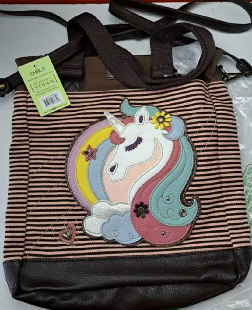 In a land where whimsy meets practicality, this enchanting unicorn tote bag emerges. With its vivid appliqué and spacious interior, it holds secrets and treasures alike. Striped patterns weave stories of adventure, while vegan leather ensures an ethical journey. A charming companion for those who dare to dream and wander.