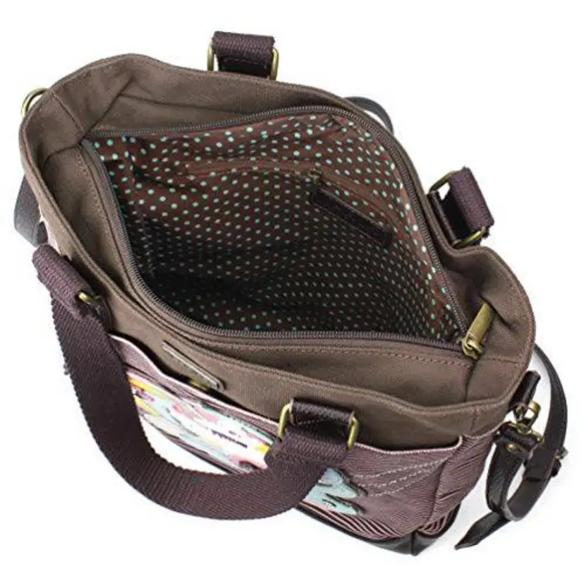 Materials: Canvas / Faux Leather | Approx. Measurements: 12.5" Wx 15"H x 3.5"D | Handle Drops: 10" | Strap adjustable: 12"-24"