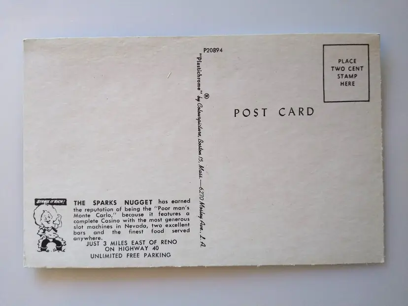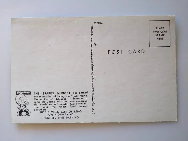 Unit of Sale: Single Unit Number of Items in Set: 1 Occasion: Any Signed: No Size: Standard (5.5 x 3.5 in) Year Manufactured: 1960 Material: Paper City: Sparks Original/Licensed Reprint: Original Brand/Publisher: Colourpicture Subject: Casino Type: Printed (Lithograph) Continent: North America Era: Photochrome (1939-Now) Country: United States Region: Nevada Theme: Cities & Towns, Hotel & Restaurant, Tourism, Casino, History, Slot Machines, Table Games, Gambling Hall, Saloon, Cars, Automobile, Cafe, Neon Sign Features: Chrome Time Period Manufactured: 1960-1969 Country/Region of Manufacture: United States Postage Condition: Unposted