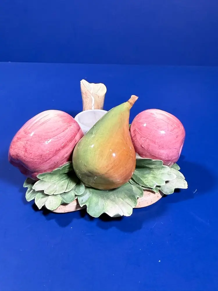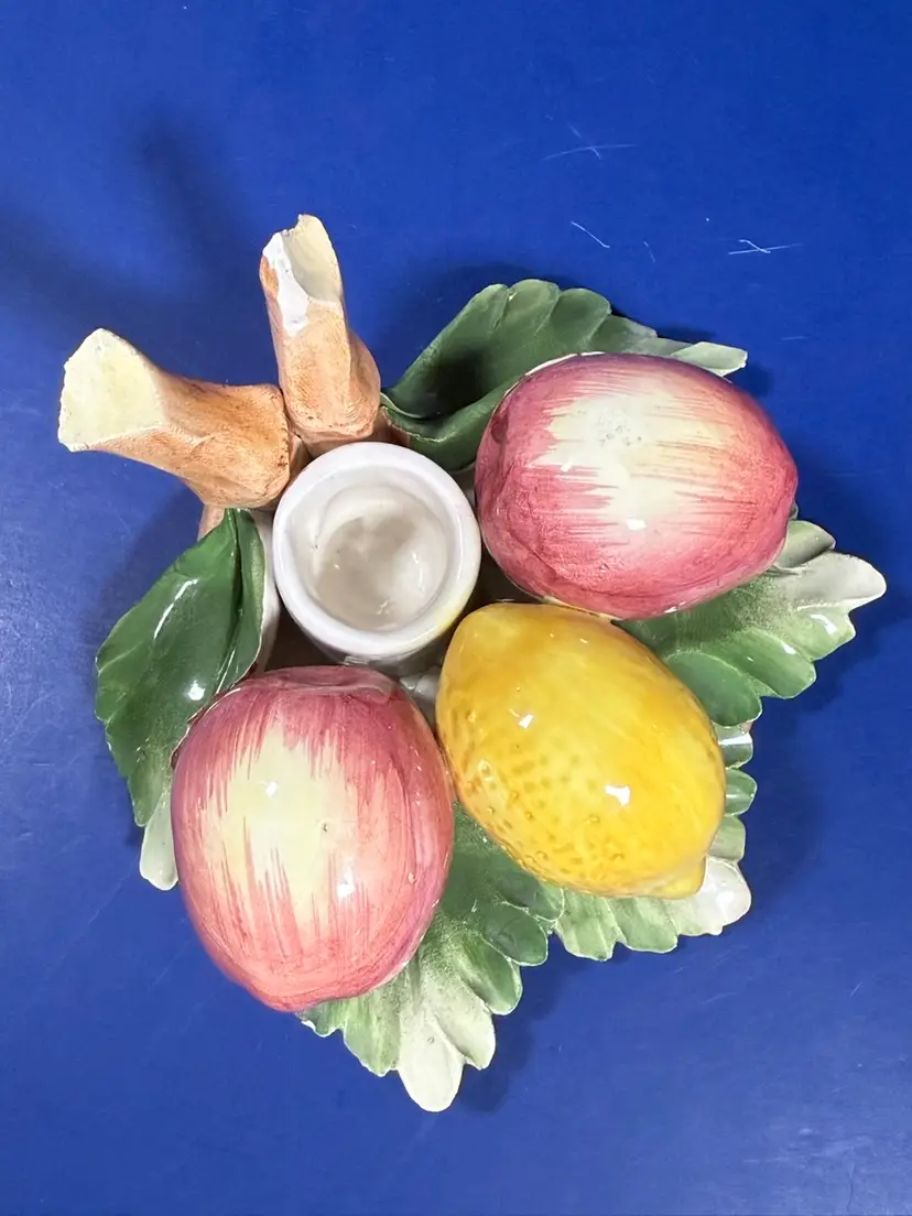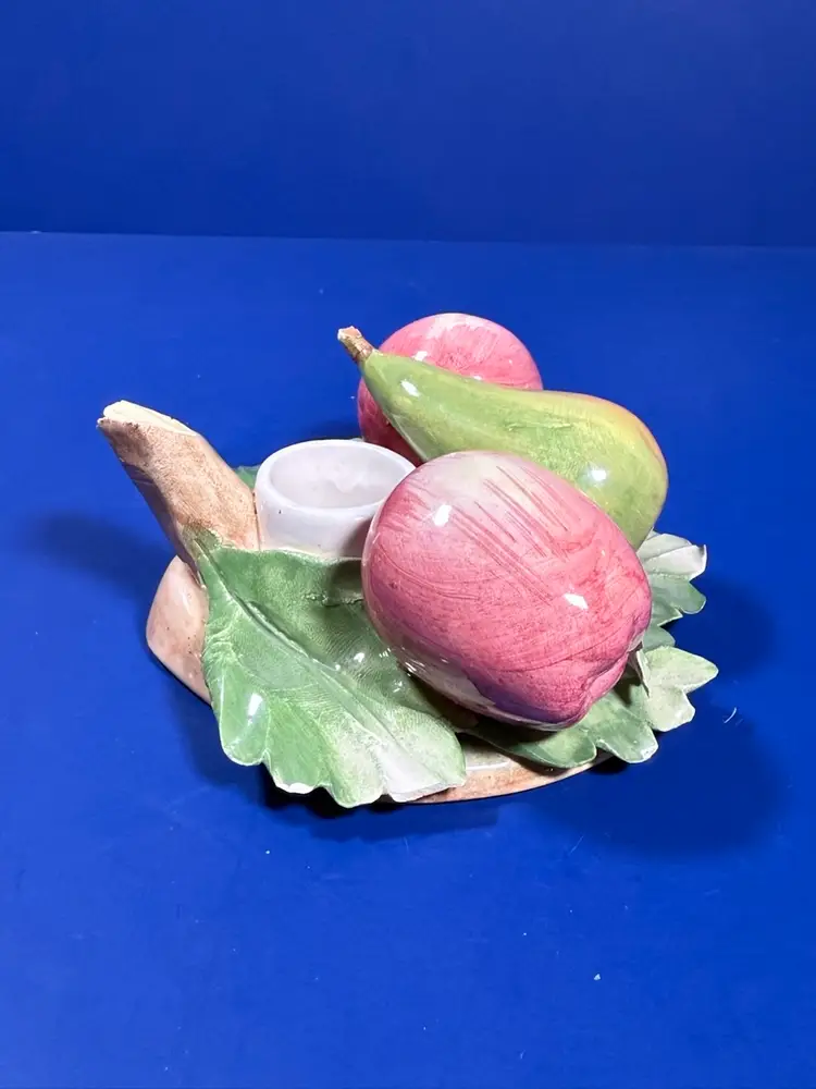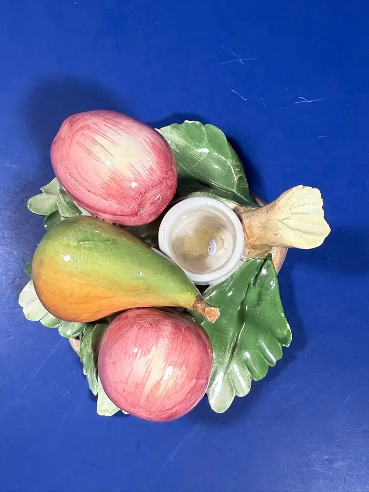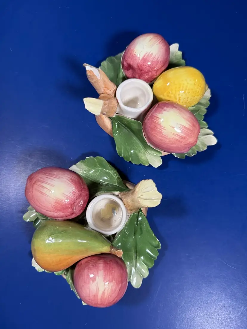 • Pair of Nuova Capodimonte ceramic candlestick holders, marked Capodimonte Made in Italy • Each measures approx. 5 inches wide • Features hand‑sculpted fruit clusters with glossy finish — apples, pears, lemons, and leaves • A small chip on the stem of one holder and a few tiny, non‑distracting chips on some leaves • Otherwise very good condition with vibrant color and strong glaze • Classic Capodimonte craftsmanship with detailed fruit and foliage • Perfect for collectors of Italian ceramics, Capodimonte, or vintage kitchen décor • Ready for display