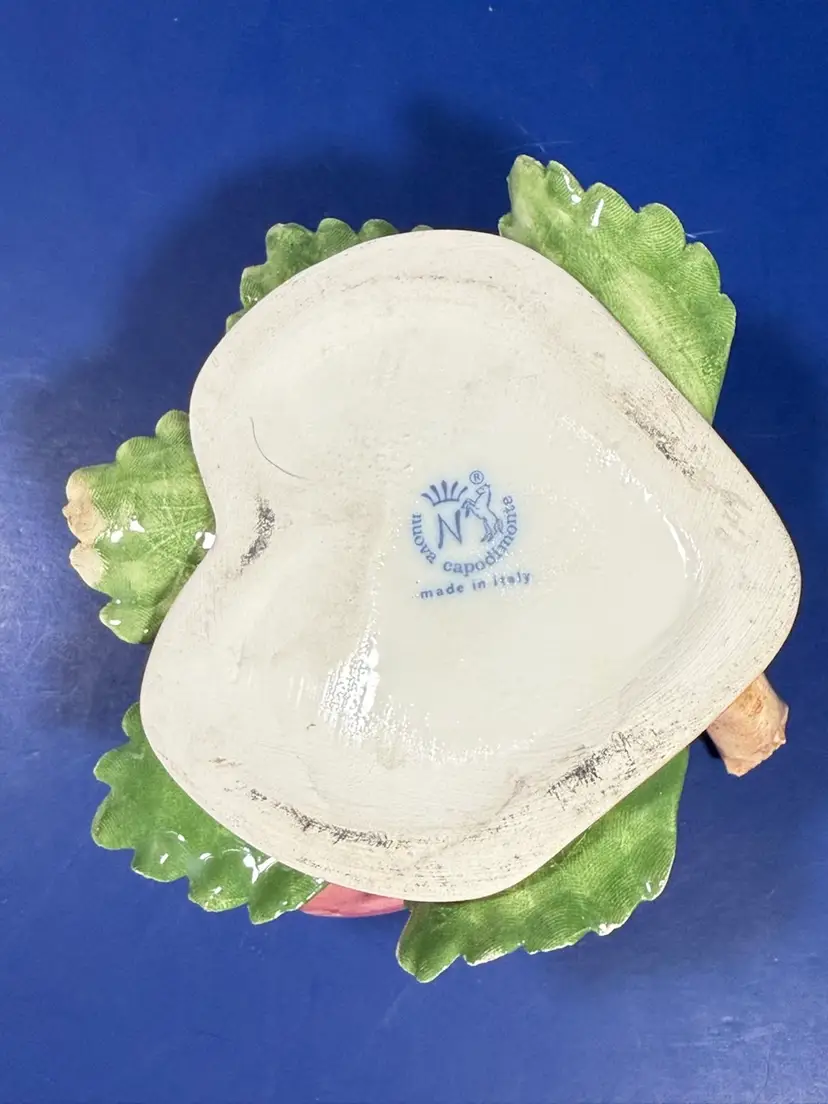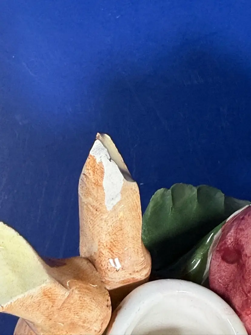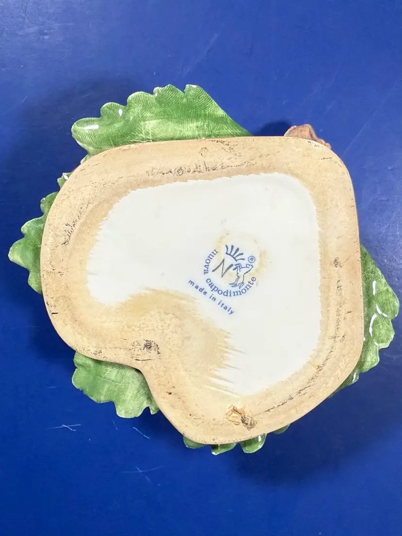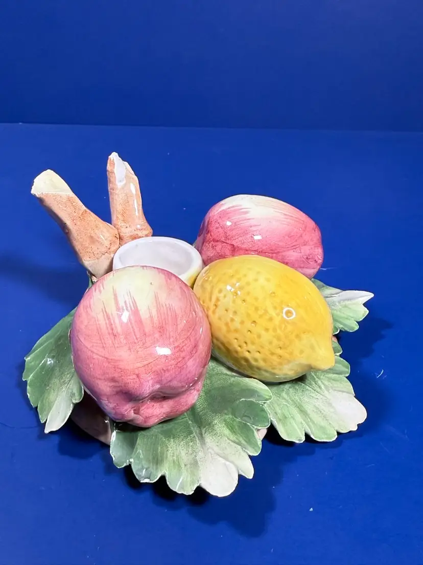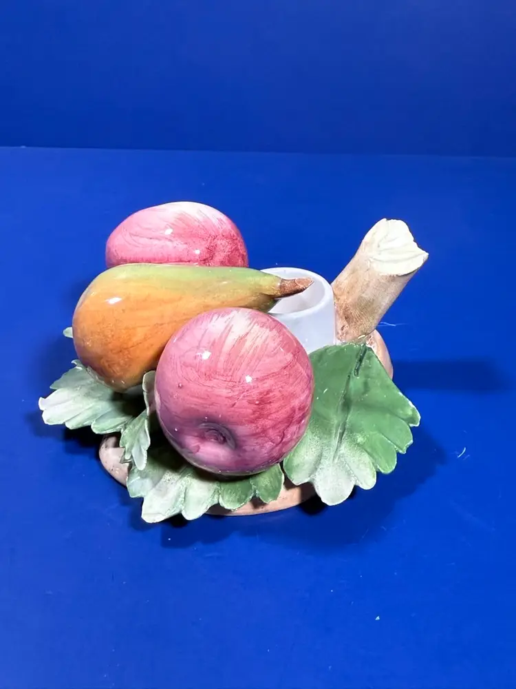 • Pair of Nuova Capodimonte ceramic candlestick holders, marked Capodimonte Made in Italy • Each measures approx. 5 inches wide • Features hand‑sculpted fruit clusters with glossy finish — apples, pears, lemons, and leaves • A small chip on the stem of one holder and a few tiny, non‑distracting chips on some leaves • Otherwise very good condition with vibrant color and strong glaze • Classic Capodimonte craftsmanship with detailed fruit and foliage • Perfect for collectors of Italian ceramics, Capodimonte, or vintage kitchen décor • Ready for display