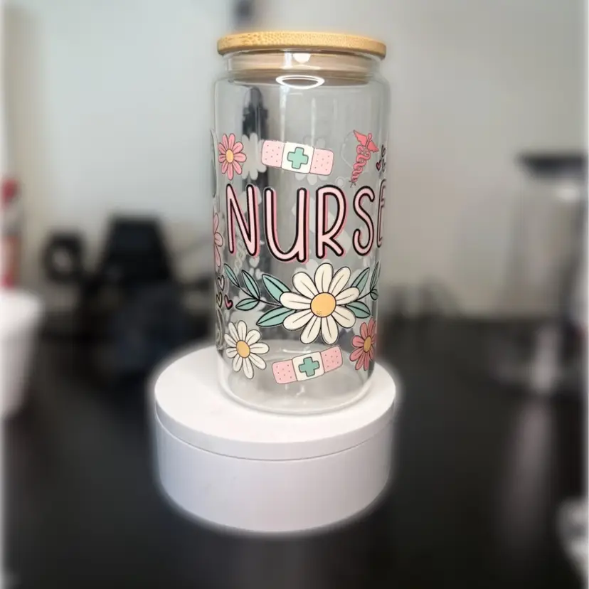 Nurse 16oz glass cup with bamboo lid COMES WITH PLASTIC REUSABLE STRAW