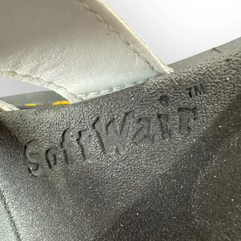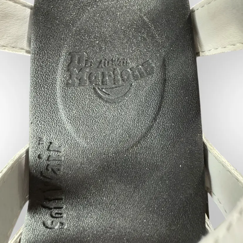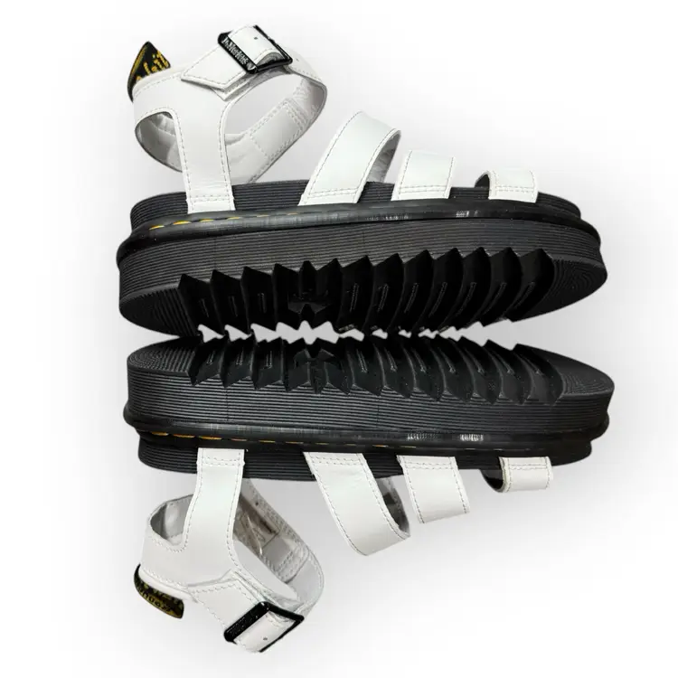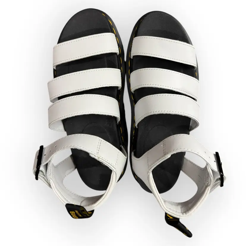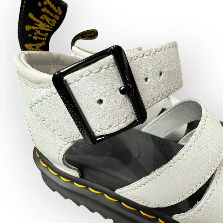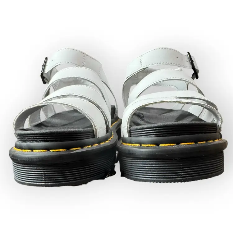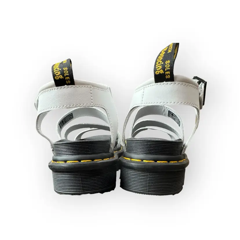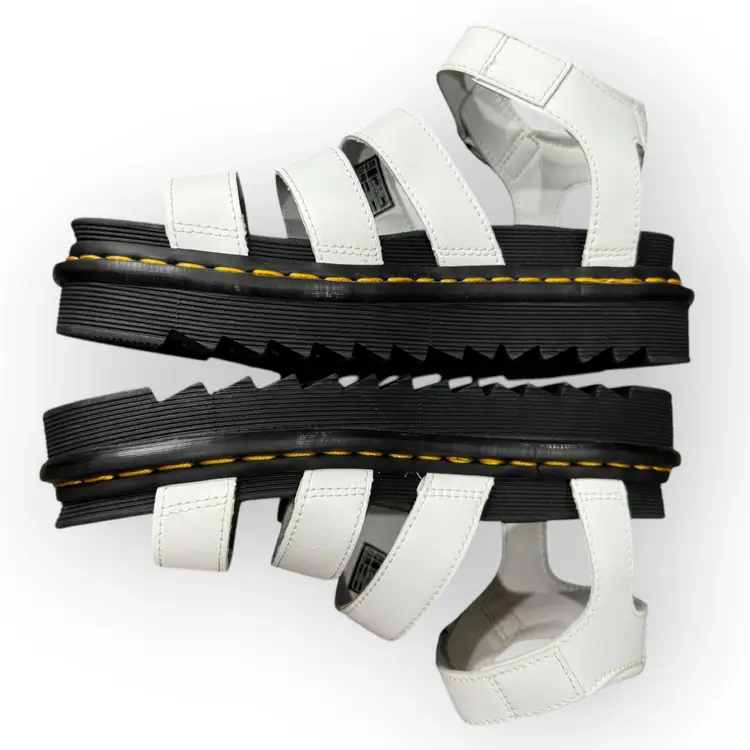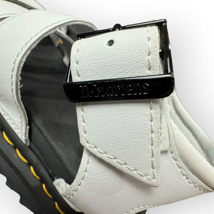Perfect for summer! Brand new, never worn, no box. Ladies Doc Martens Blaire white leather sandals, size 7. Black cushioned footbed and chunky sole. Signature yellow welt stitching around the sole.