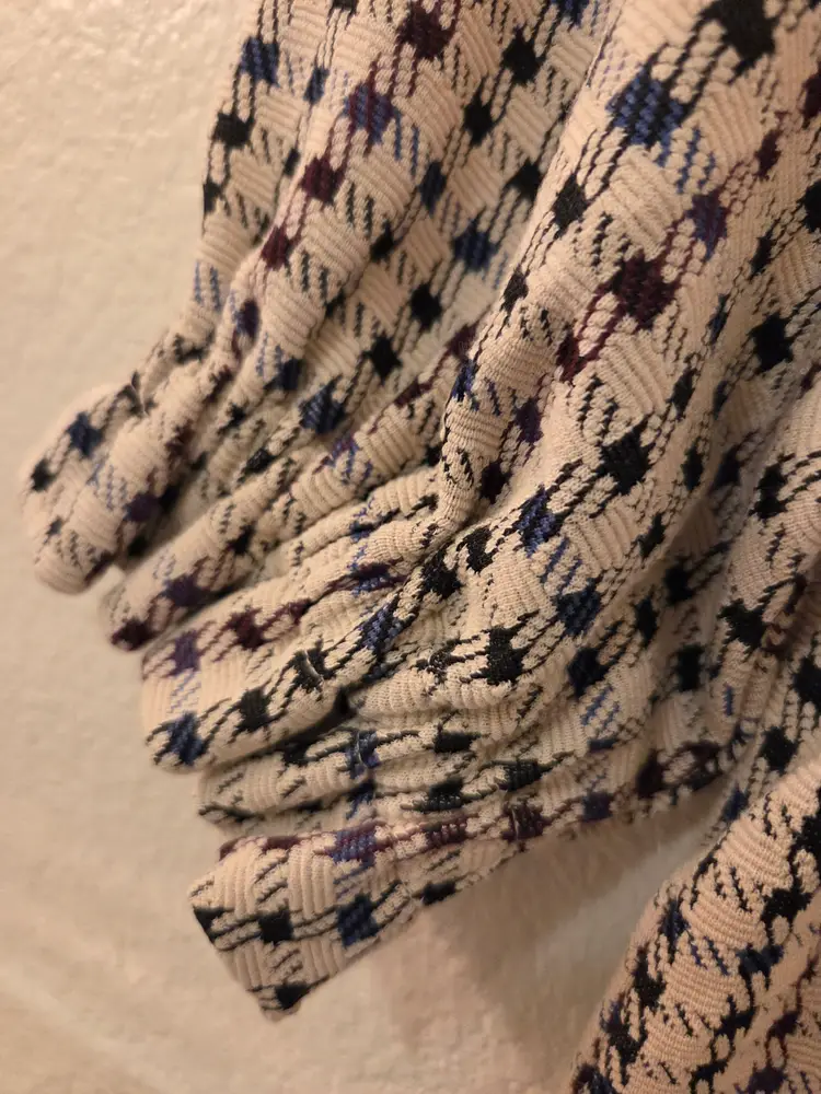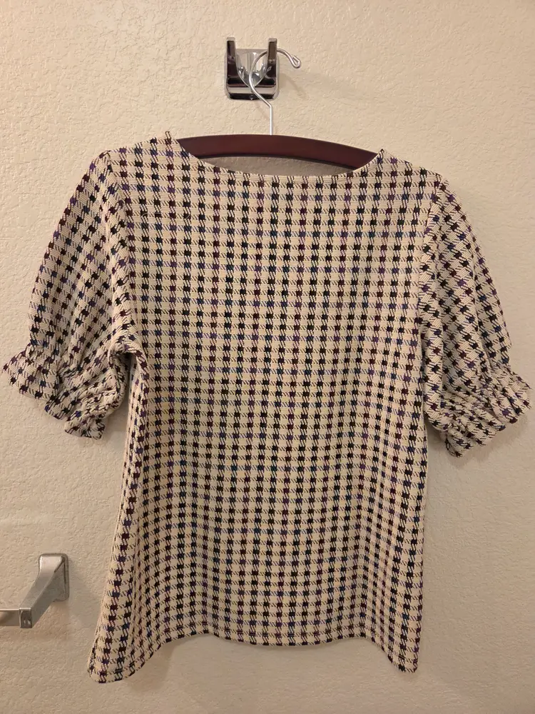 NWOT Ann Taylor Petite ladies XXSP houndstooth off-white, burgundy, blue and green puff sleeve top. Pit to pit 16" and length 21 1/2". Made in Vietnam. Fabric content; 58% cotton, 40% polyester, and 2% spandex. Machine wash cold.