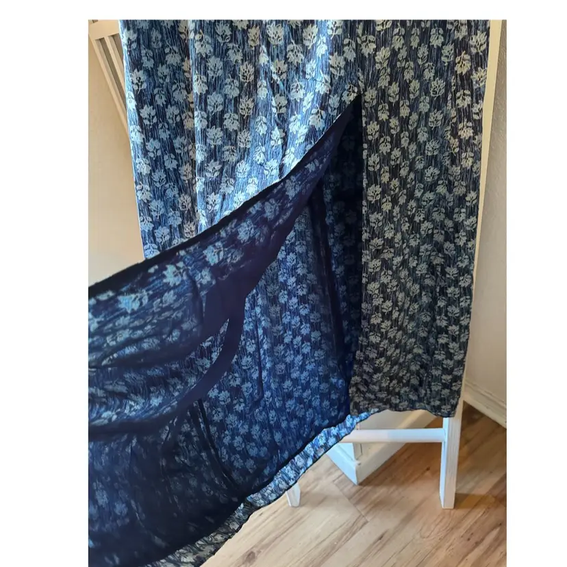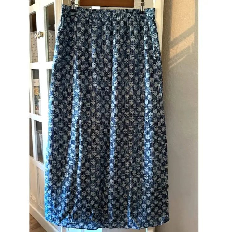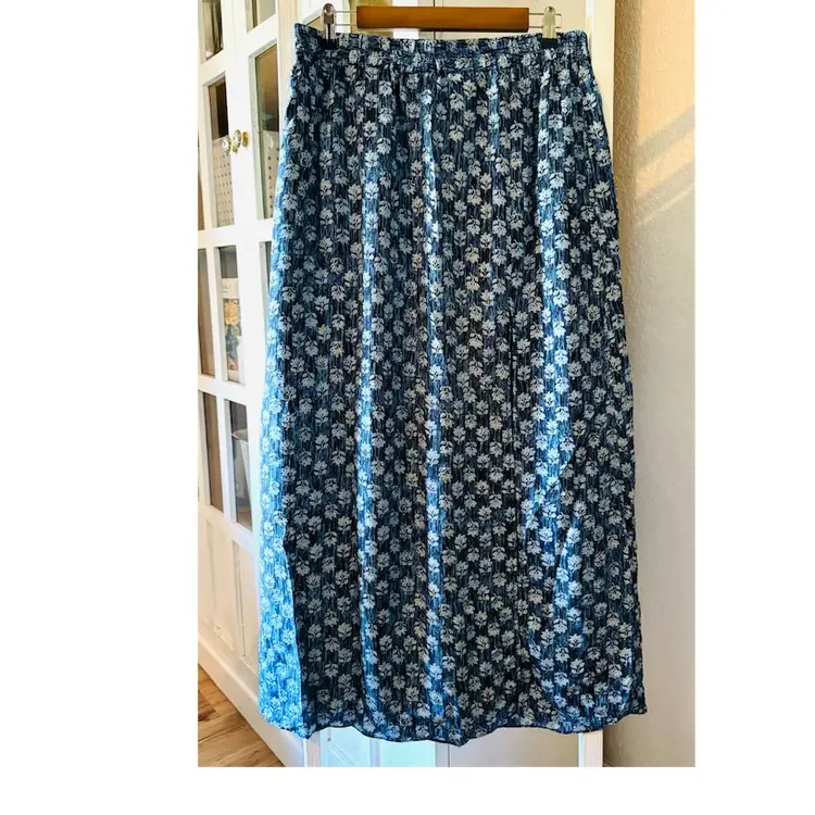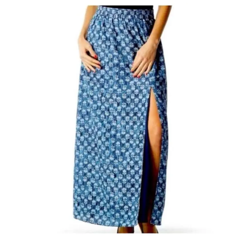 A thigh-high front slit amps up the drama on a maxi skirt patterned in a richly colored leaf print. Elastic waist. Pull-on style. 24" slit. 100% polyester. Machine wash.