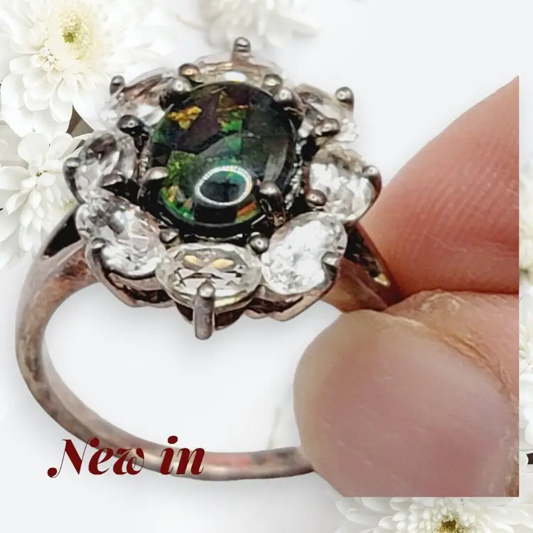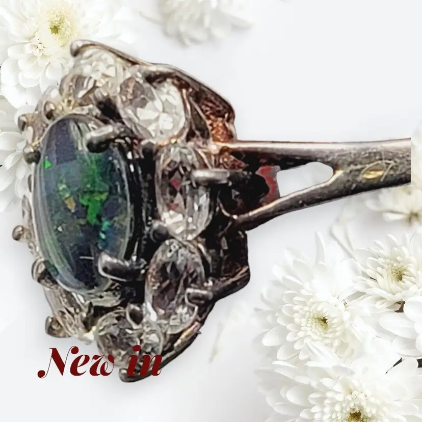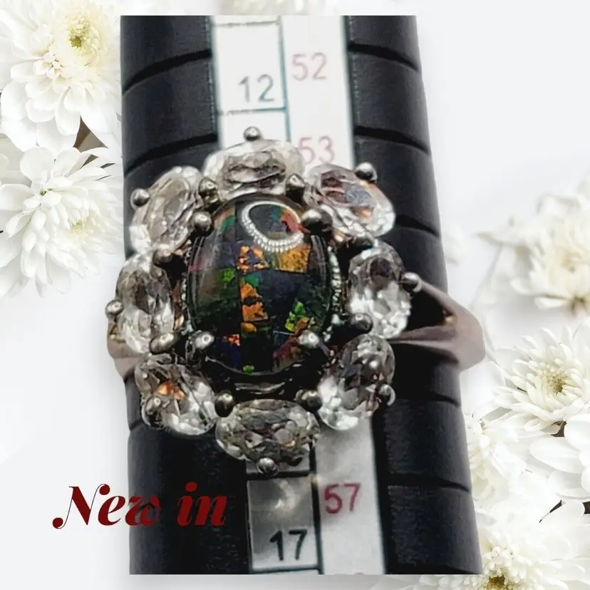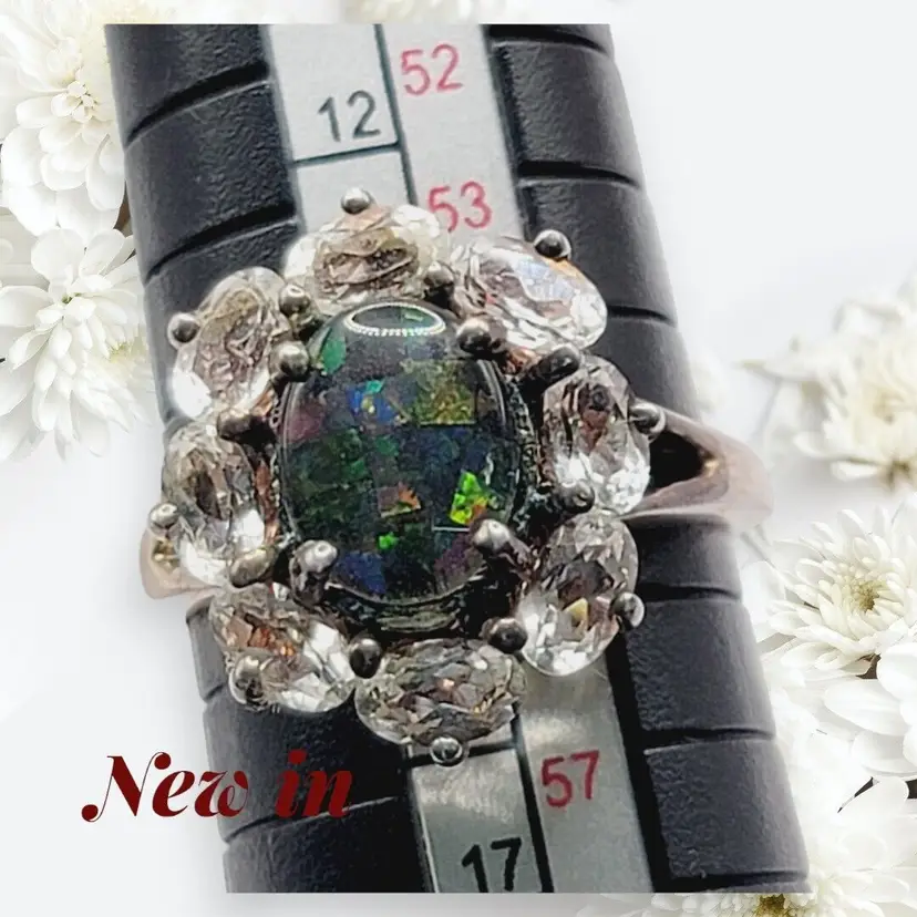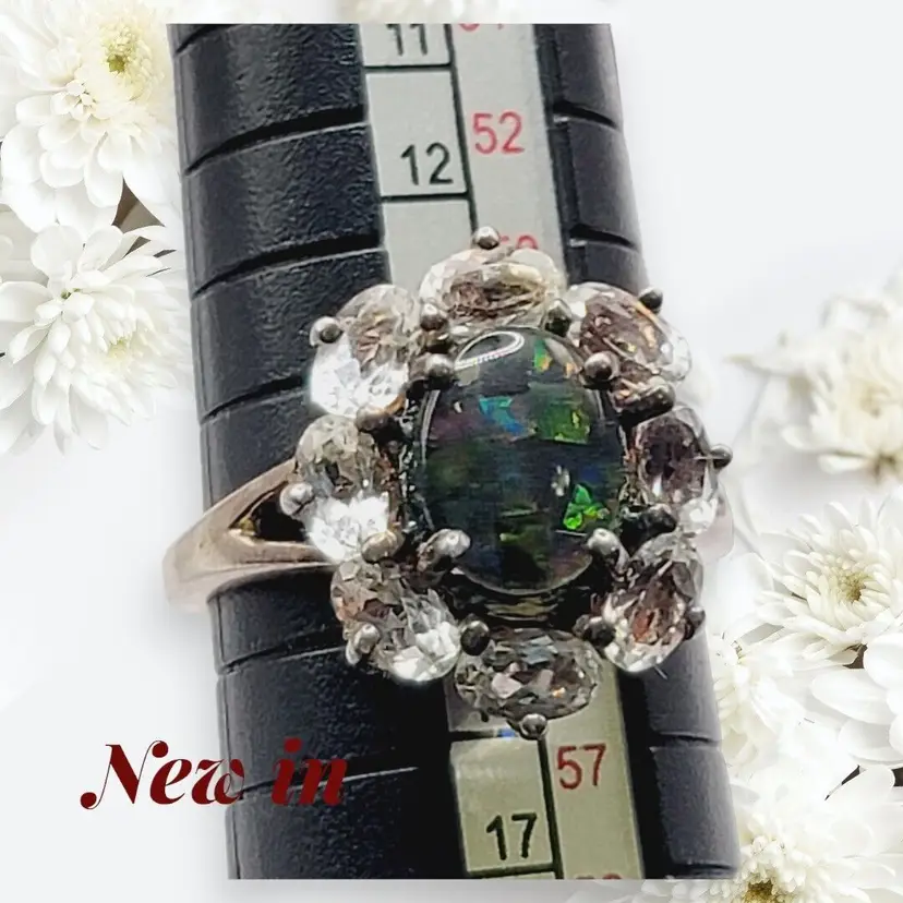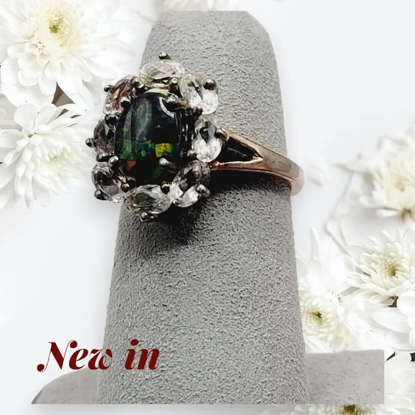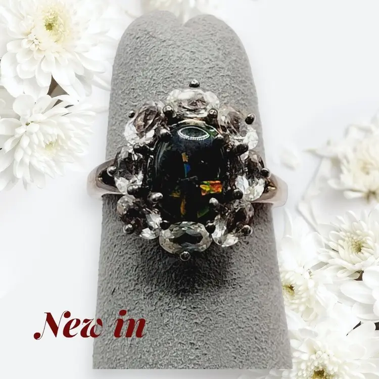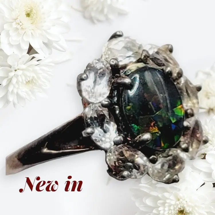 – Shape: Flower – Occasion: Anniversary, Birthday, Christening, Christmas, Engagement, Graduation, Valentine's Day, Mother's Day, Wedding – Color: Multicolor – Main Stone Color: Multicolor – Metal: Sterling Silver – Secondary Stone: Black Opal, Fire Opal, Topaz – Main Stone: Fire Opal – Brand: Handmade – Setting Style: Cluster – Ring Size: 7.5 – Type: Ring – Metal Purity: 925 – Main Stone Shape: Oval – Base Metal: Silver – Number of Gemstones: 9 – Handmade: Yes