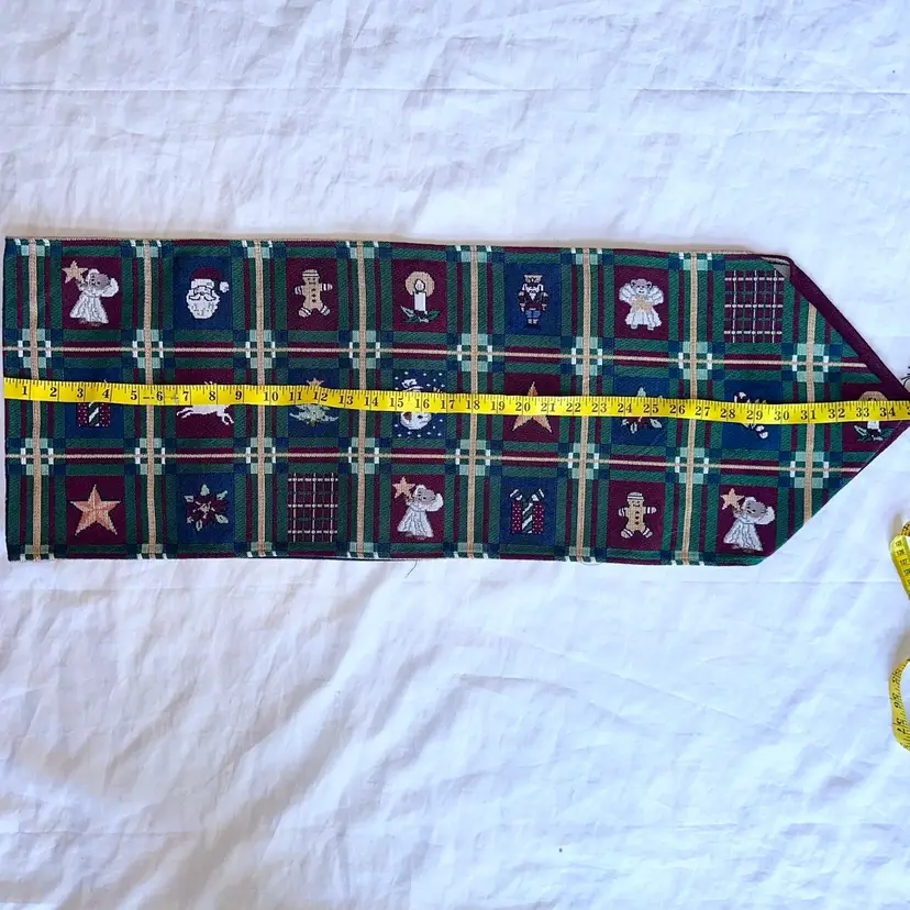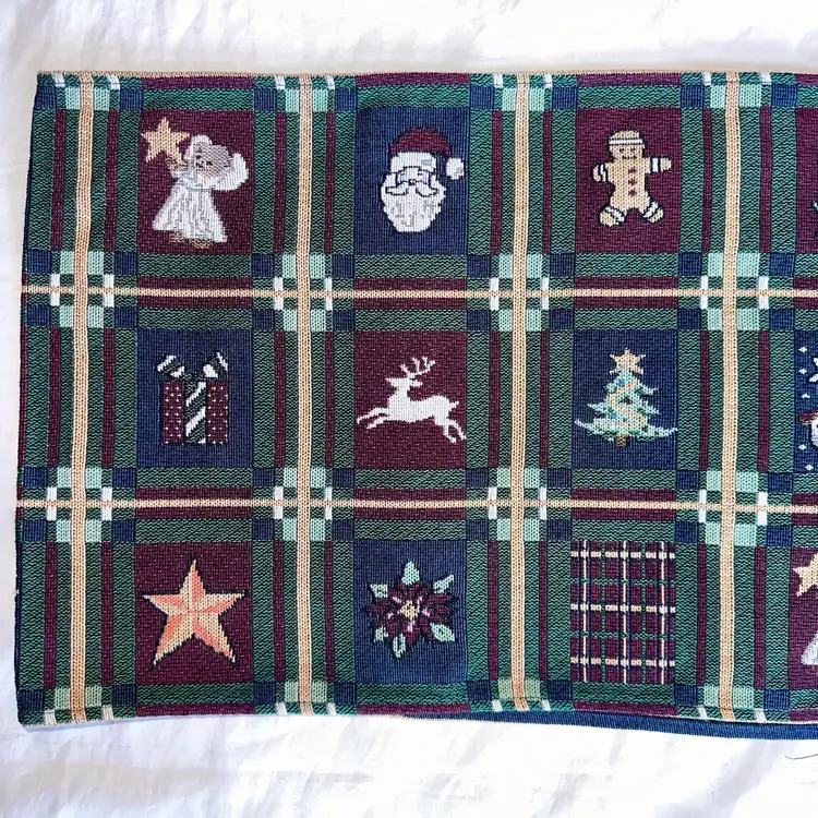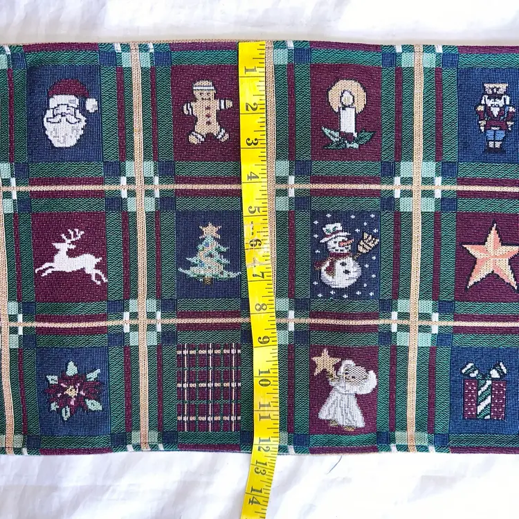 New Without Tags Unbranded Tapestry Christmas Theme Table Runner 12 x 70. Beautiful Tapestry Table Runner With Squares Of Christmas Theme Images. Tassels at each end of runner. Smoke Free Home. #christmas #tablerunner #holidaydecor #tabledecor #holiday