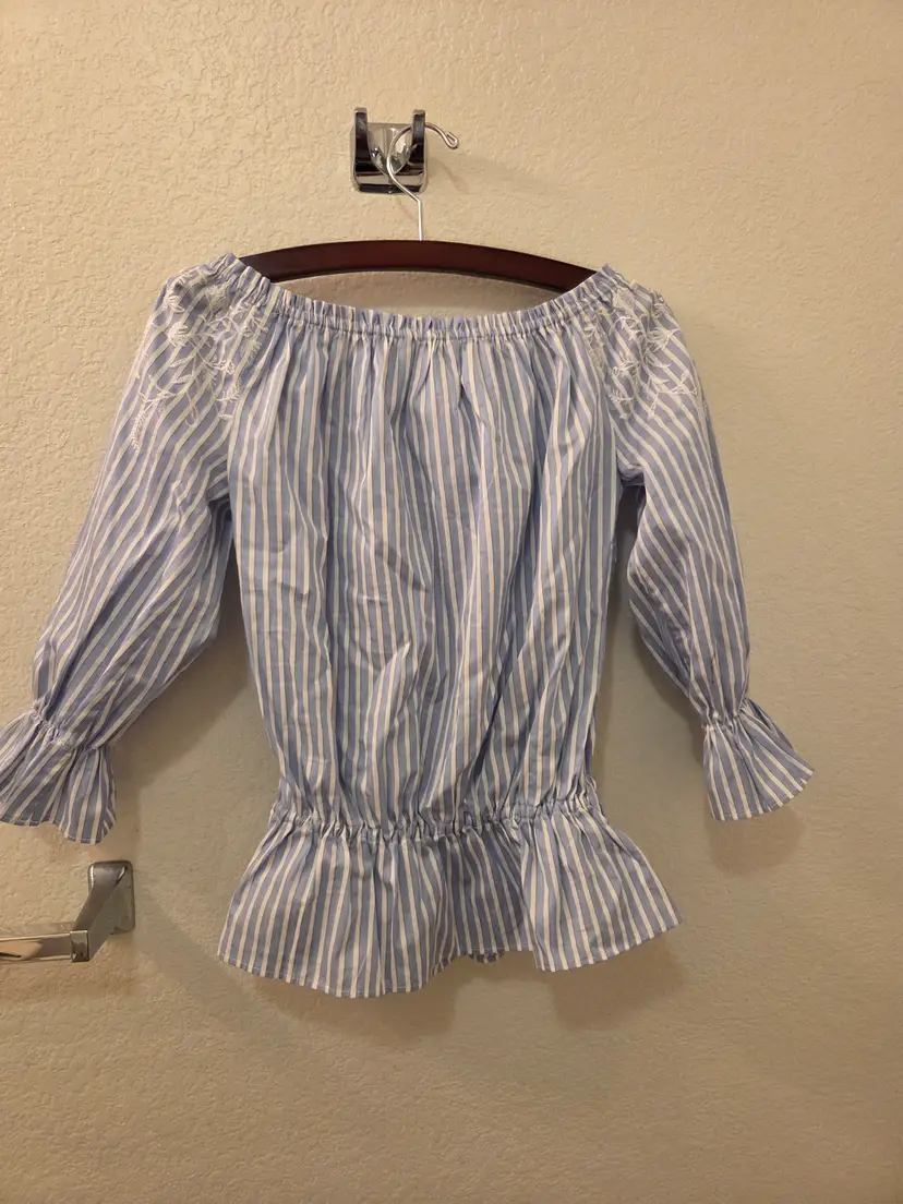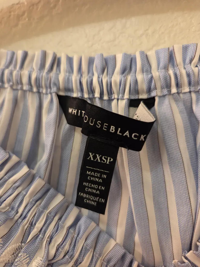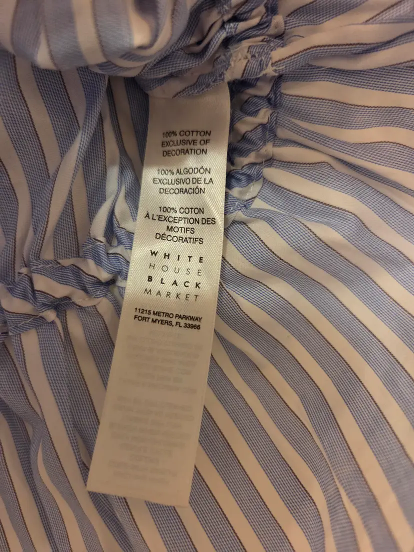 NWOT White House Black Market ladies XXSP blue and white striped off the shoulder blouse. Pit to pit 14" and length is 19". Made in China. 100% cotton exclusive of decoration. Machine wash cold.