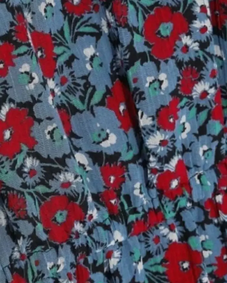 New with tags, MRSP $525 This dress is a floral-print Georgette Cotton and silk-blend. It has ruffled trims and an open back. It has an elastic waist and ties at the back. Slips on Fully lined Non-stretchy fabric Mid-weight fabric. Dry clean. Imported. 75% Cotton, 25% Silk. Color: blue/Red