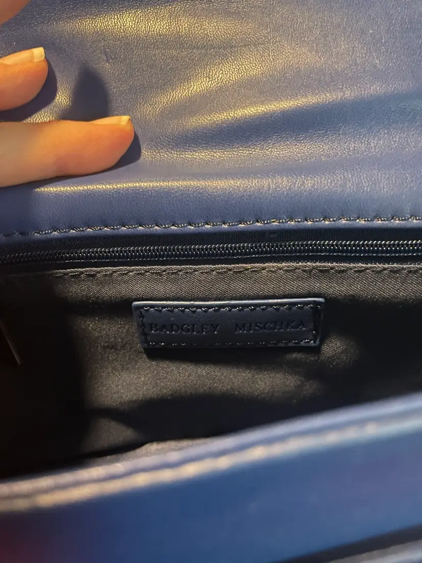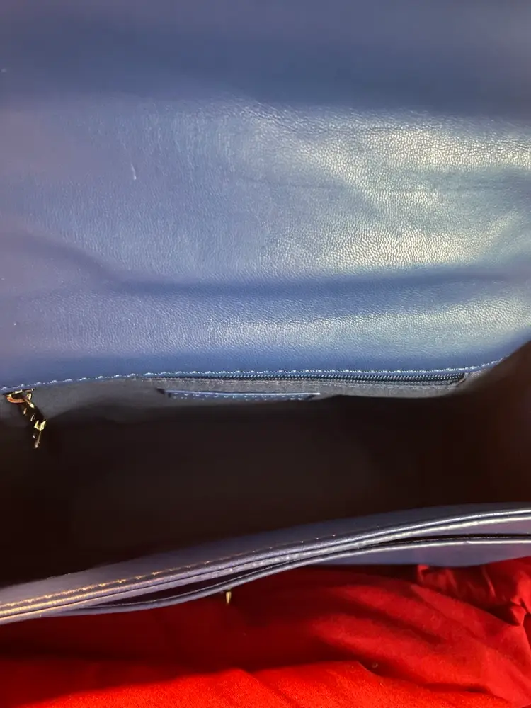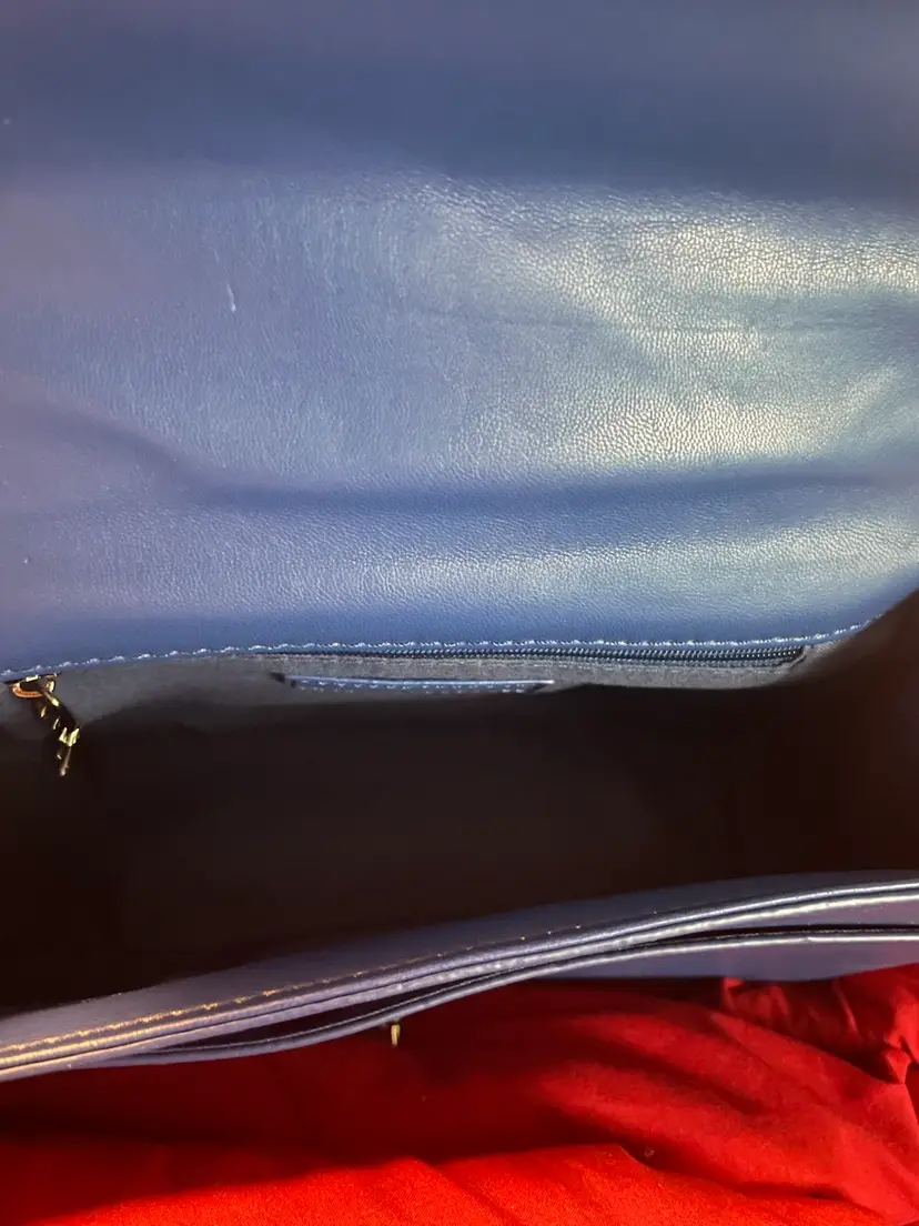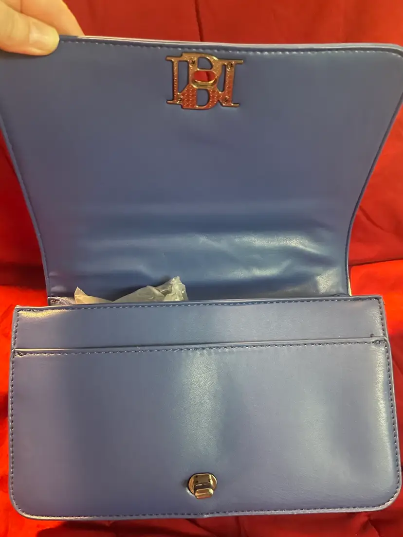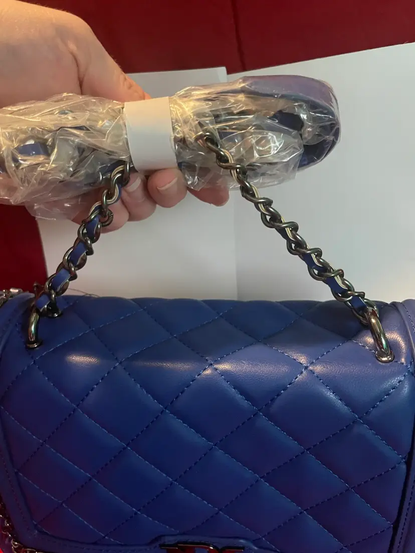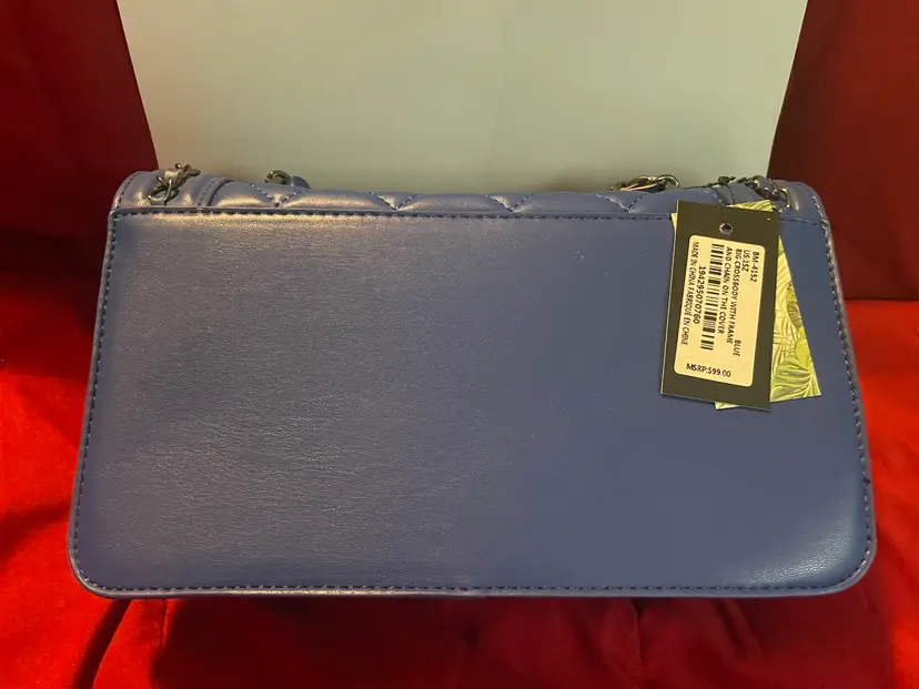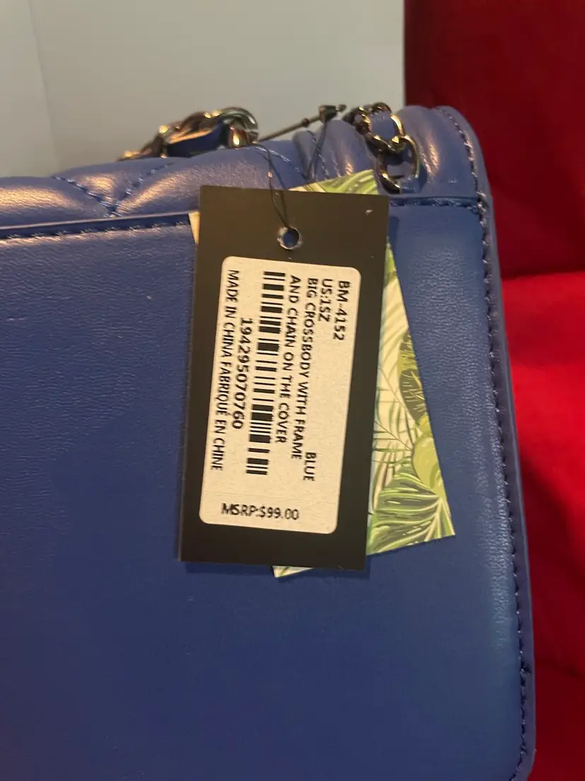Beautiful blue quilted design front on this crossbody chain strap purse. The front shows off a gunmetal grey chain design with matching chain strap. Brad new