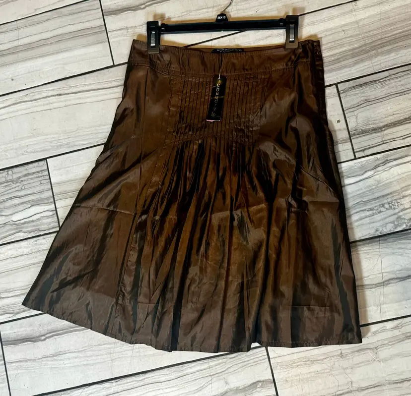 Fantastic brown iridescent to the skirt with pleaded look to the front. Very lightweight and free-flowing great for all seasons. Side zipper to slip you into this beauty. Waist is 14 length is 23. This is a sample piece NWT.