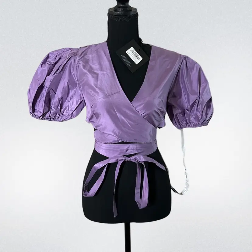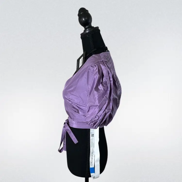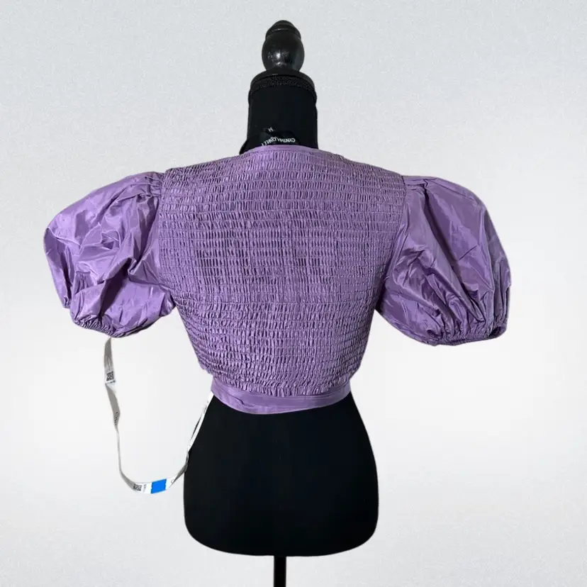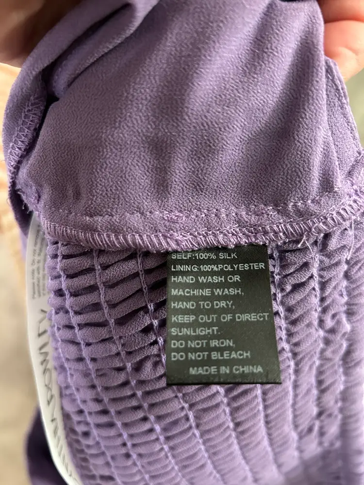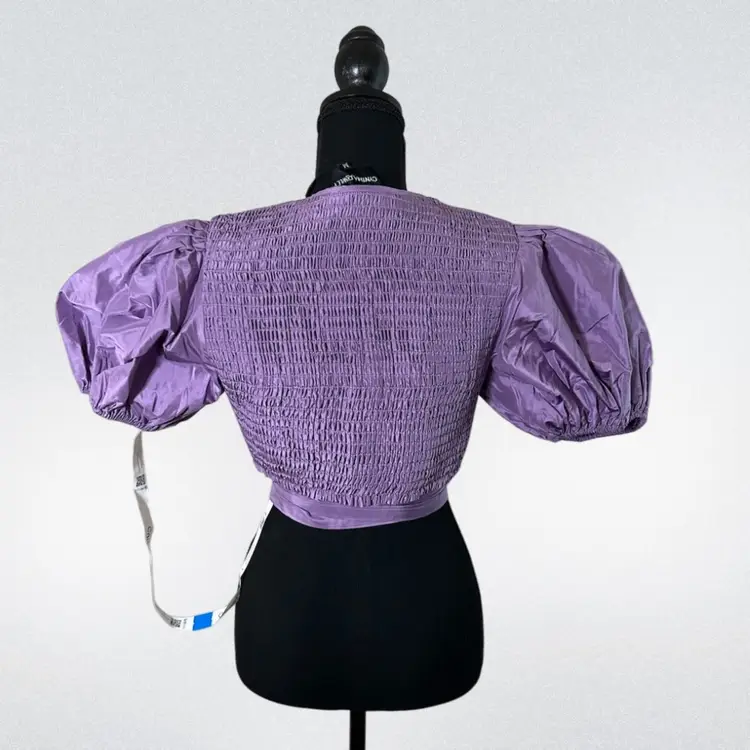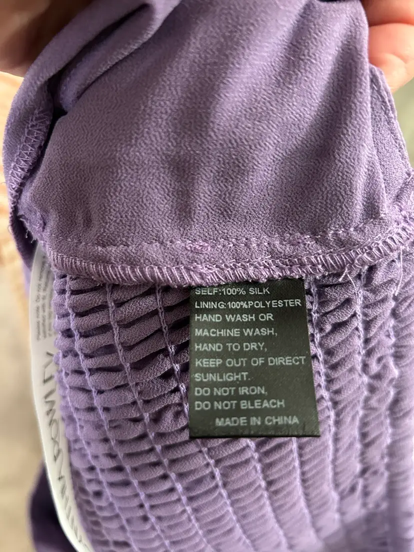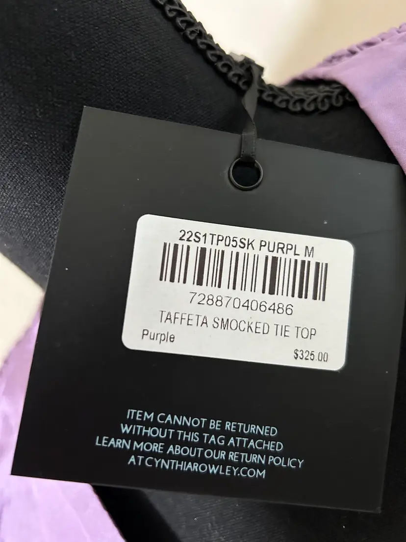 Purple Smocked Tie Top Size Medium Self:100%Silk Lining:100% Polyester Hand or Machine Wash, Hang to Dry. Keep out of Direct Sunlight! Do not Iron. MSRP$325
