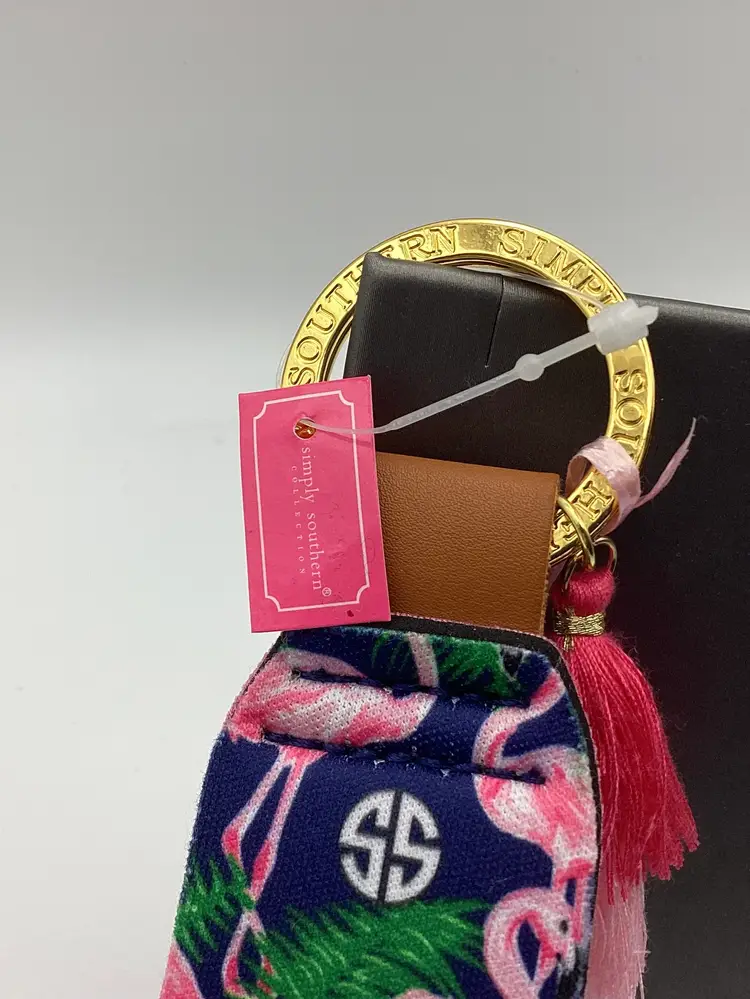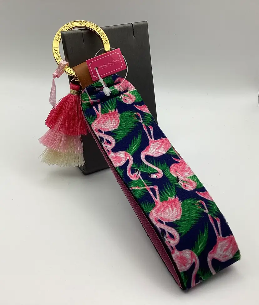 Brand: Simply Southern Identifier: SS / Simply Southern on key ring / Has tag Features: Flamingos / 3 tone tassel / Goldtone key ring Material: Cloth / Metal Pattern/Design: Flamingos / Palm Branches Color: Navy / Pinks / Green Measurements: Height - 9” (including tassels ) Width - 1 and 1/2”