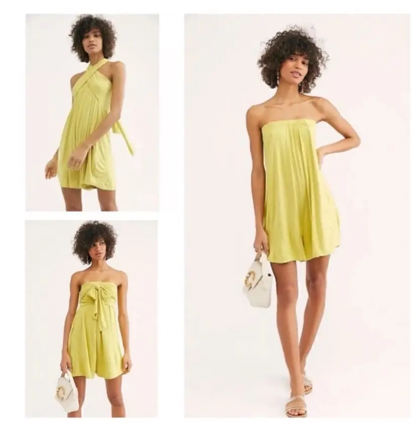 New with tags *per website fits relaxed/large New with Tags American made romper featuring a versatile and convertible strap for multiple ways to wear. Easy and soft stretchy fabric Elastic band Shapeless fit Hip pockets FP Beach Effortless seaside designs for a laidback, throw-on-and-go approach to dressing. Care/Import Machine Wash Cold Measurements for size small Waist (relaxed): 29 in Hips: 58 in Rise: 25 in Inseam: 4 in 5% Spandex 95% Rayon