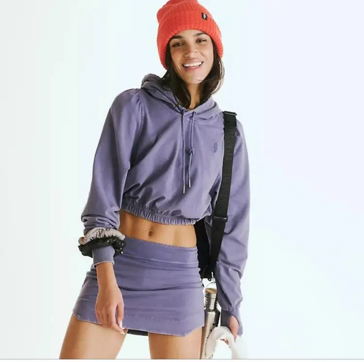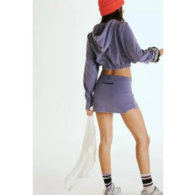 Features: Smooth, soft jersey fabrication; lightweight and breathable feel; cropped top silhouette; drawstring adjustable hoodie; ribbed cuff detail; skirt has wide waistband, drawstring adjustable; flattering slits on side seams; back zipper pocket; embroidered Buti logo on top and bottom