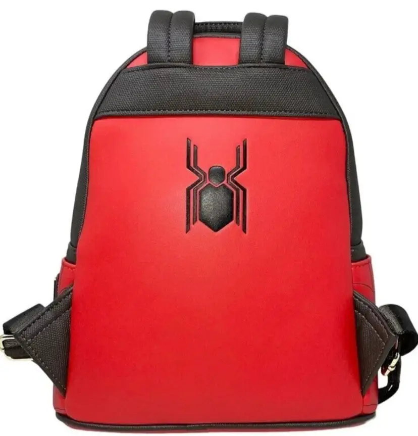 This Loungefly Marvel Spider-Man No Way Home Cosplay Mini Backpack is made of faux leather with zipper closures, top handle and adjustable straps.