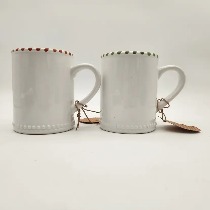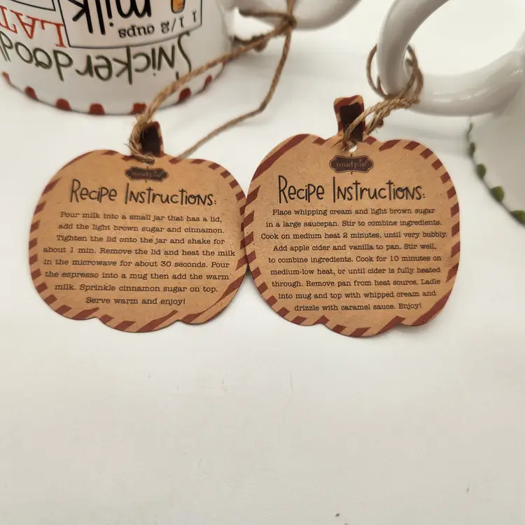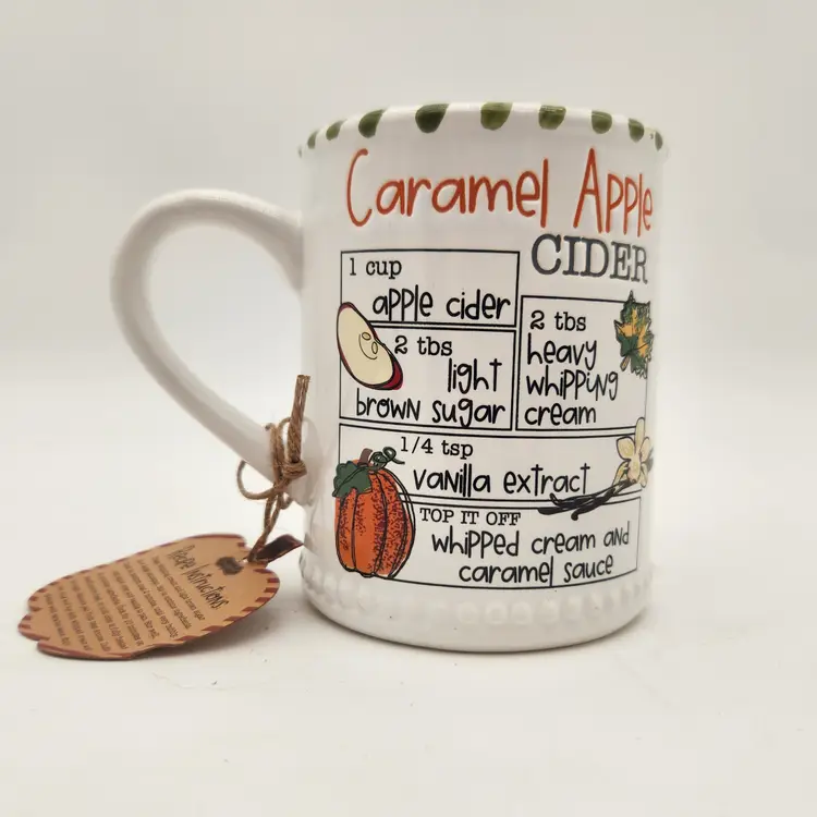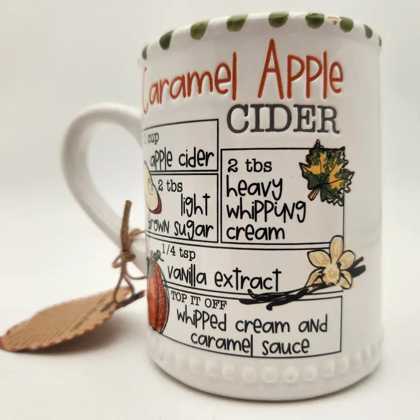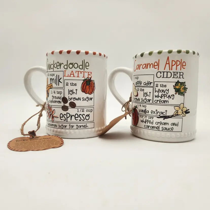 Fall is in the air and it's time for those beverages that warm the soul - and here are the mugs literally wearing the recipes for two delicious options! Measurements: 4 1/2" tall, 3 1/4" diameter at rim. Each mug holds 12 ounces. Please note: Mugs are sold as a set of 2. The price is for 2 mugs. Features: Microwave Safe, Suitable for Hot Beverages