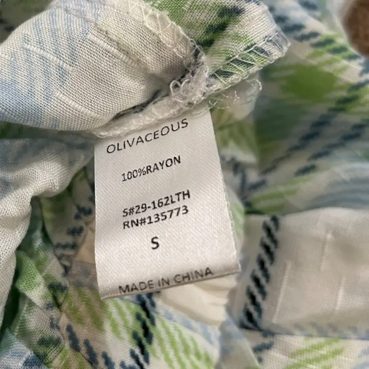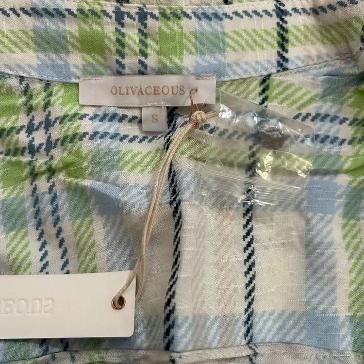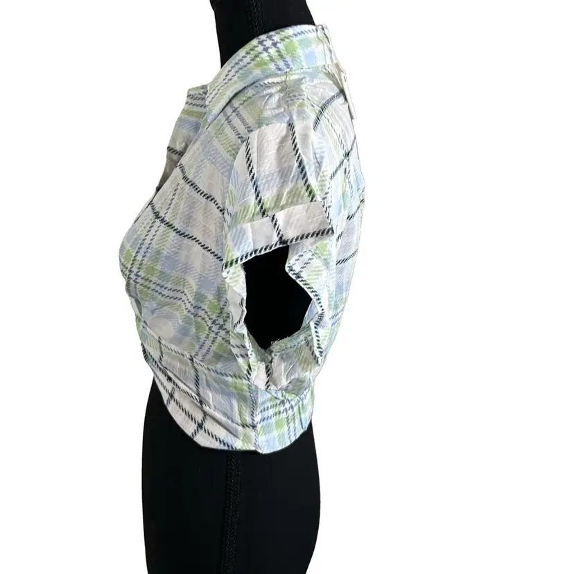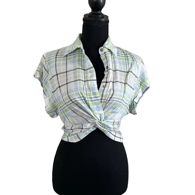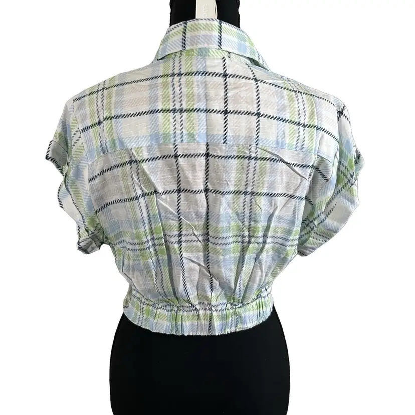 Size Small Light colored plaid crop top S#29-162LTH RN#135773 Machine wash cold water, hand dry 100% Rayon Made In China MSRP$89