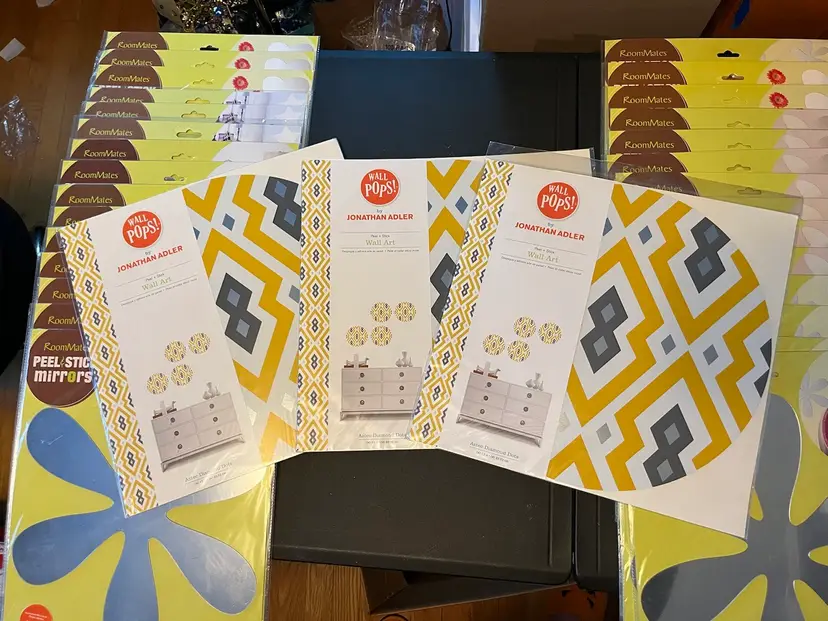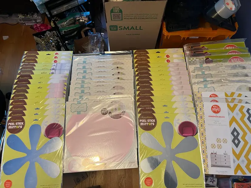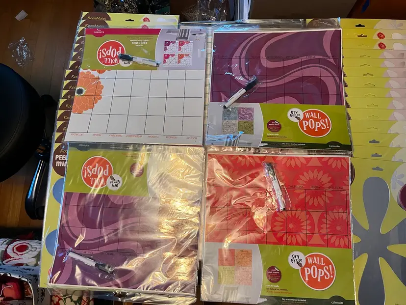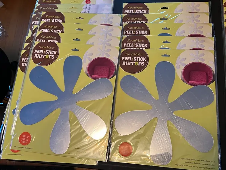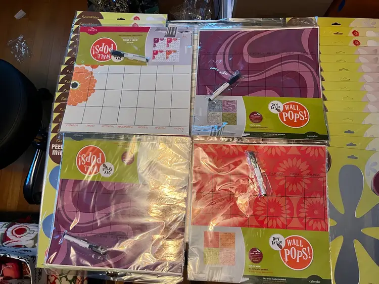 Includes: 6x dry erase calendars 2x brown dot 1x yellow dot 3x ivory dot 4x baby blue dot 5x Gigi pink dot 3x Jonathan Adler 3x neon dot 9x flower power mirror 7x butterfly mirror 3x skull mirror 5x heart mirror 2x fancy mirror 3x star mirror
