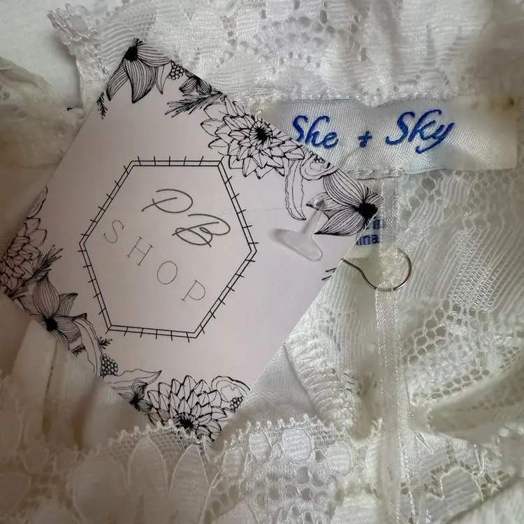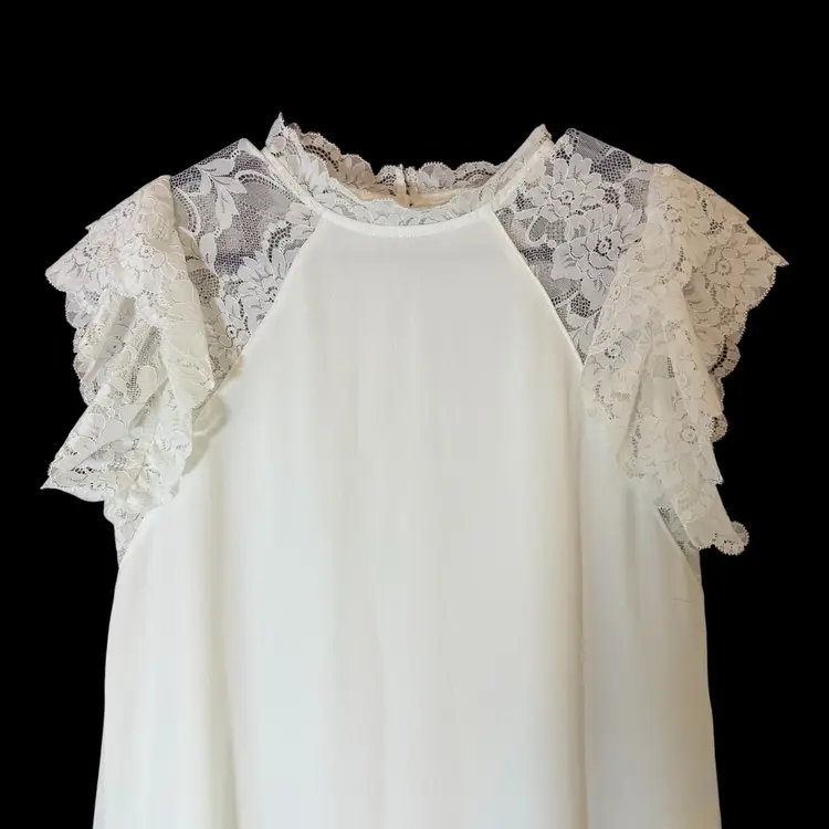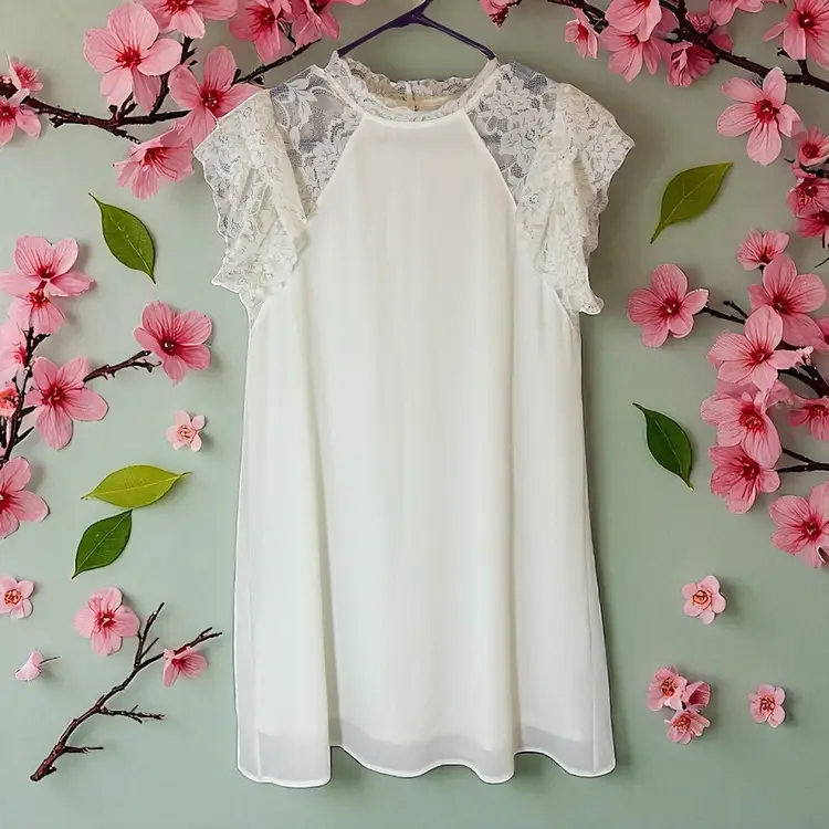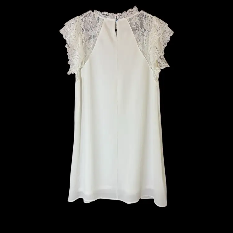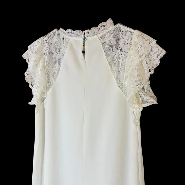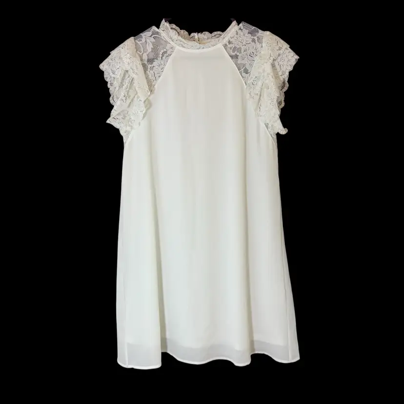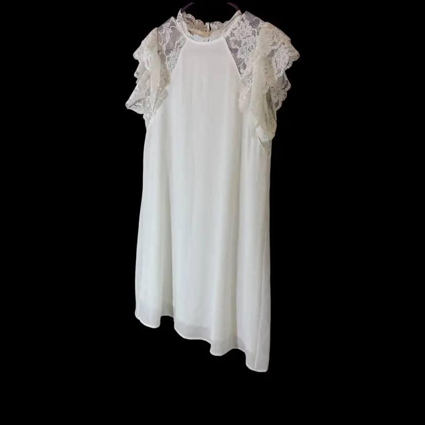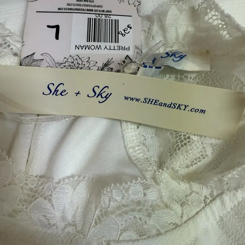 The NWT She + Sky Romantic Tunic Shift Dress in size L is a white lace sleeve coquette dress that exudes a feminine and romantic vibe. The dress features a solid pattern, short cap lace sleeves, a round neckline, and a button closure. Made from polyester crepe fabric, this short dress is perfect for various occasions such as travel, wedding, party, or casual wear. The dress is lined and hand wash only to maintain its delicate lace accents and vintage-inspired theme. Perfect for all seasons, this dress embodies a classic yet trendy style that is sure to turn heads.
