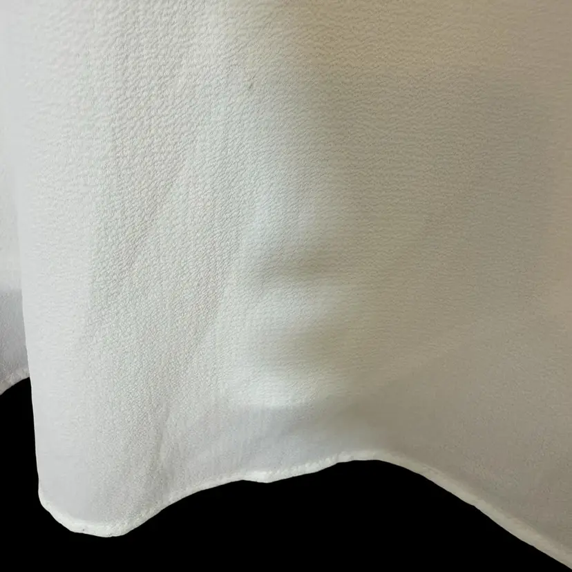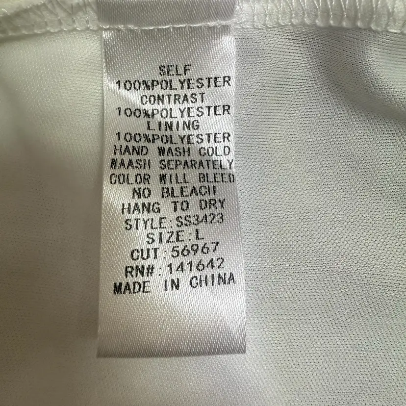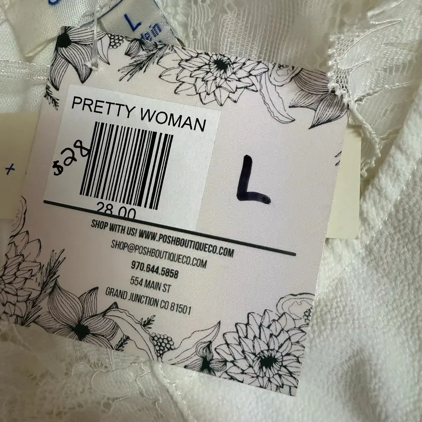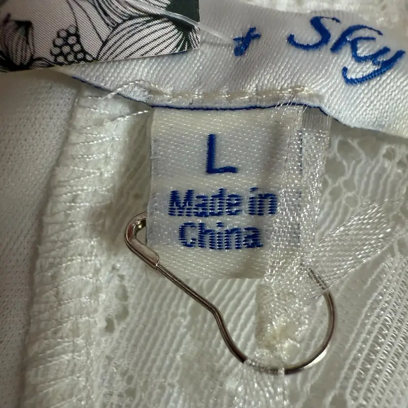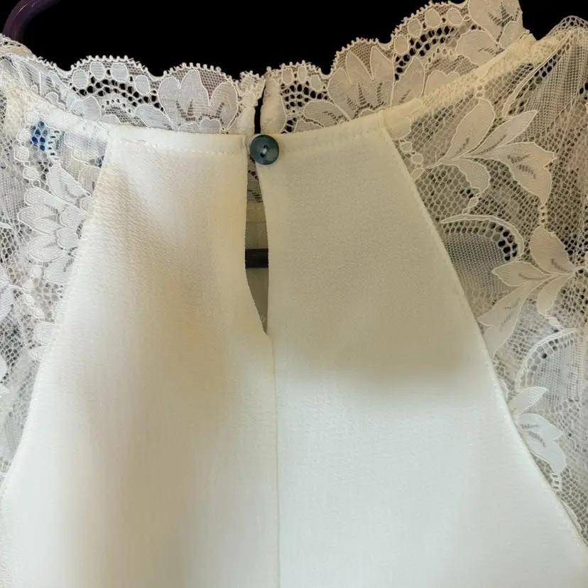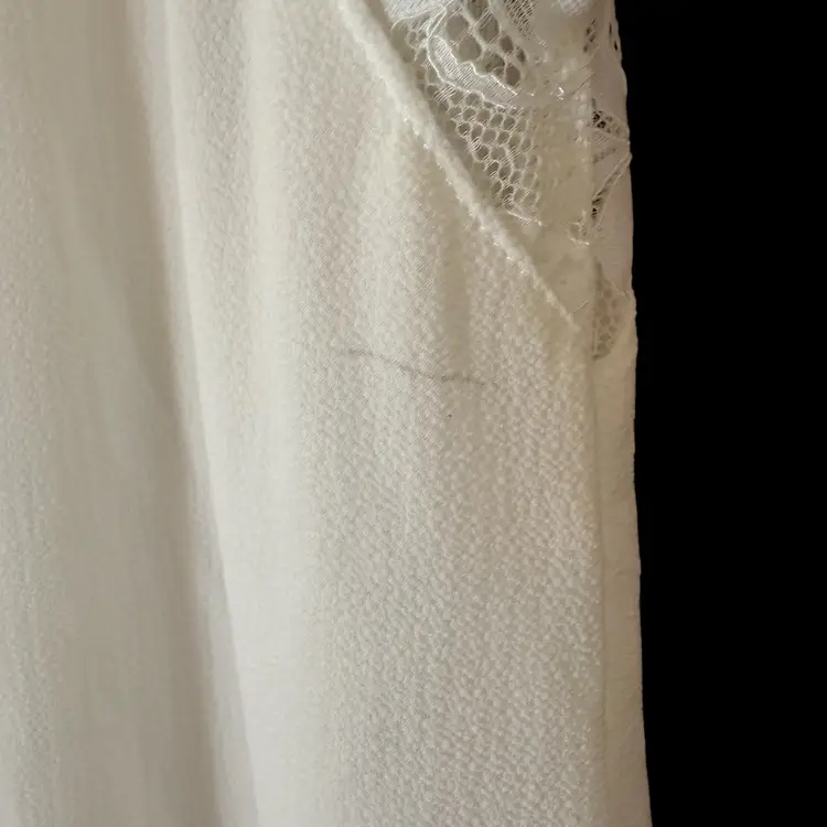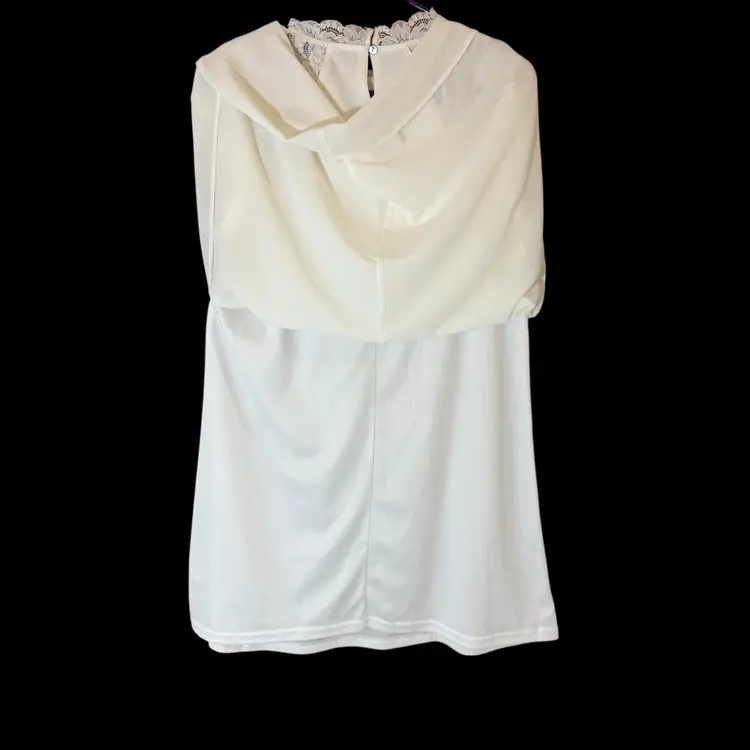 The NWT She + Sky Romantic Tunic Shift Dress in size L is a white lace sleeve coquette dress that exudes a feminine and romantic vibe. The dress features a solid pattern, short cap lace sleeves, a round neckline, and a button closure. Made from polyester crepe fabric, this short dress is perfect for various occasions such as travel, wedding, party, or casual wear. The dress is lined and hand wash only to maintain its delicate lace accents and vintage-inspired theme. Perfect for all seasons, this dress embodies a classic yet trendy style that is sure to turn heads.