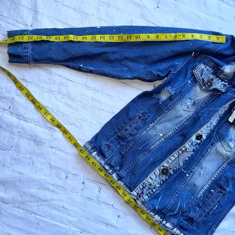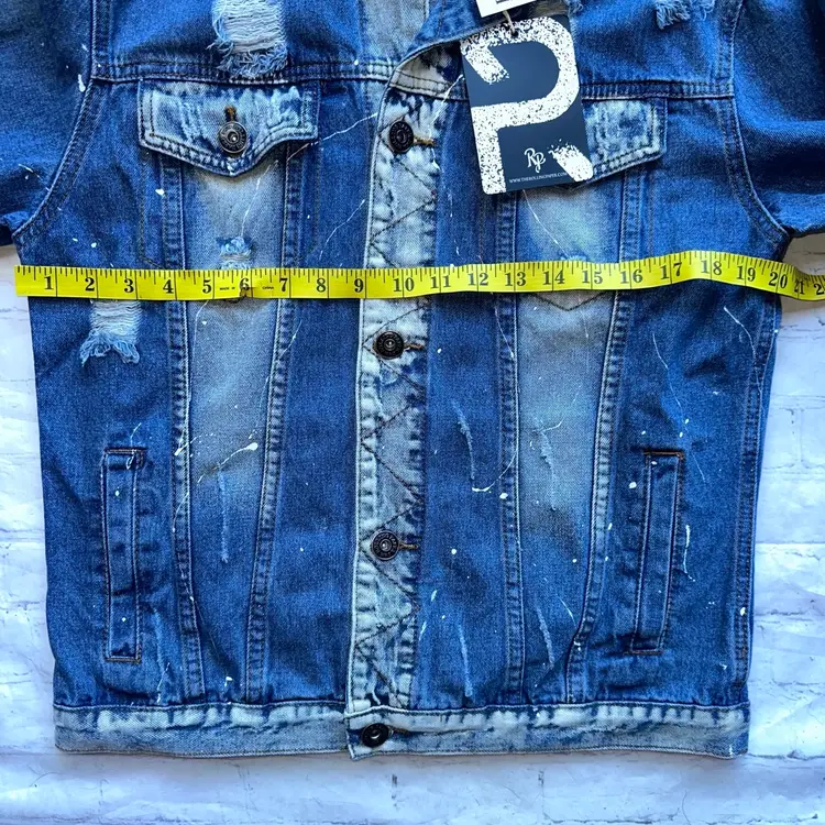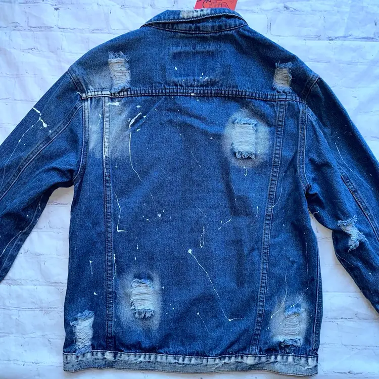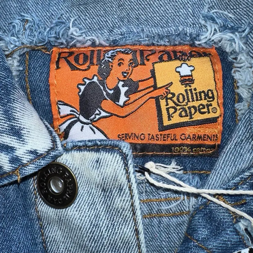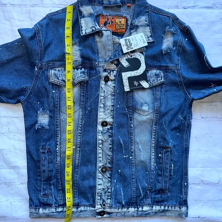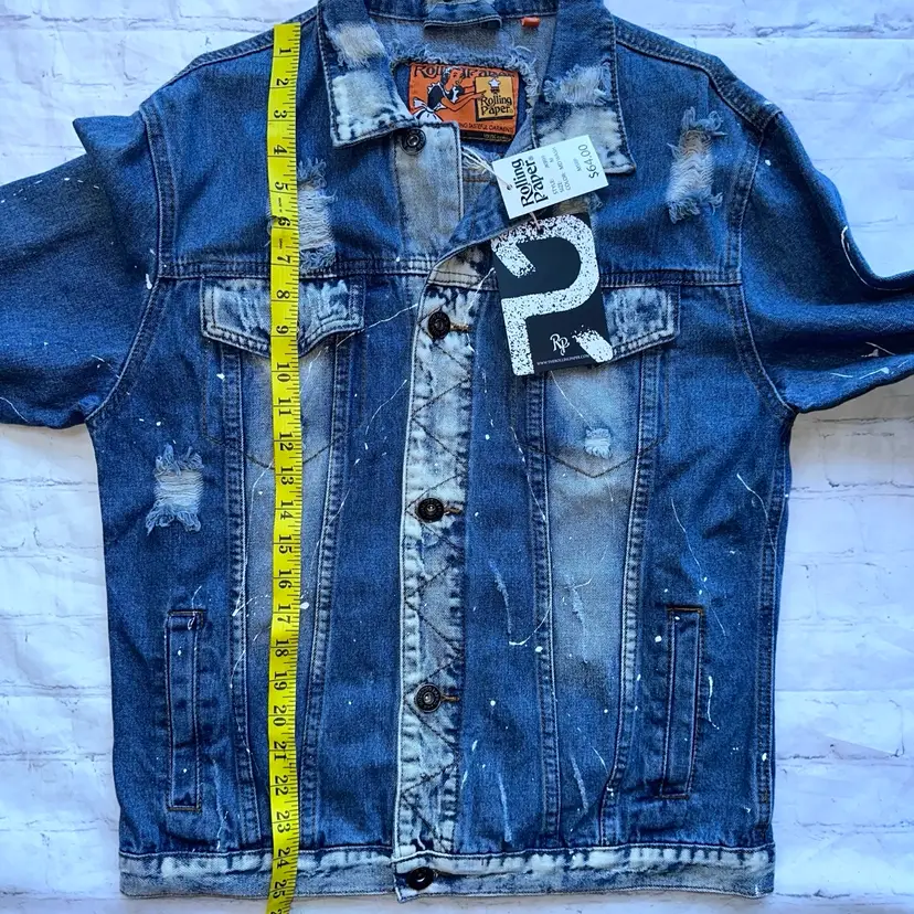 New With Tags Unisex Adult Medium Rolling Paper Distressed Denim Jean Trucker Jacket. Style JK999. Med Wash. Full Distressed Look With Paint Spatter, Torn Denim and Bleach Staining. Unique Design. 100% Cotton. Full Front Hip Pockets And Chest Pockets. Smoke Free Home. #rollingpaper #truckerjeanjacket #denimjacket #truckerjacket