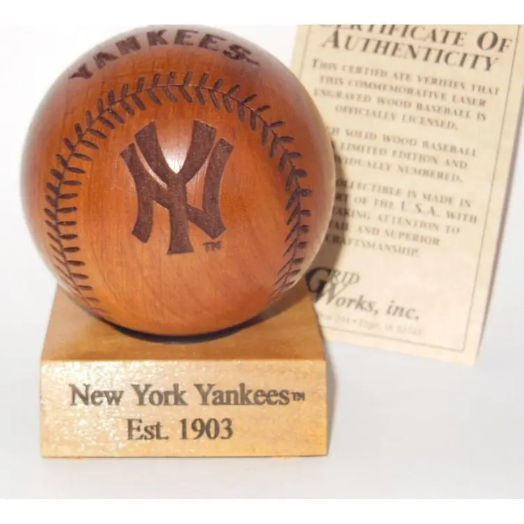Show your love for the New York Yankees with this Limited Edition Wooden Carved Baseball from GridWorks' Cooperstown Collection. Crafted in the United States, this one-of-a-kind baseball is uniquely designed with the iconic NY Yankees logo and finished in a warm brown color. It's officially licensed by Major League Baseball (MLB) and perfect for any baseball fan, regardless of gender or size. This exquisite wooden carved baseball is a great addition to any sports memorabilia or fan apparel collection. It's the perfect gift for any New York Yankees fan or baseball enthusiast, and is sure to impress with its intricate design and attention to detail. Get your hands on this limited edition piece today!