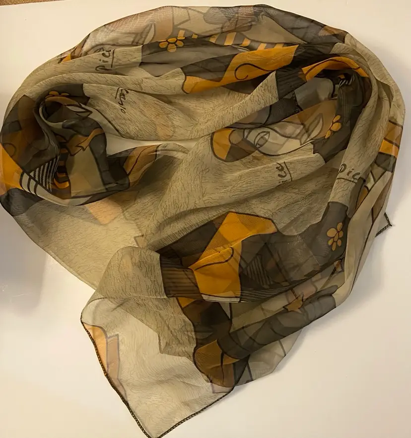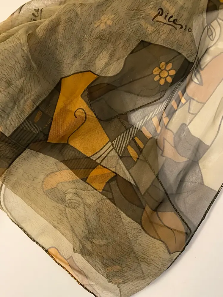 Vintage nylon oblong scarf with a art print by Pablo Picasso scarf is in good condition with no flaws. It is in a green and rust color way.