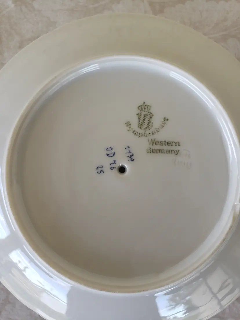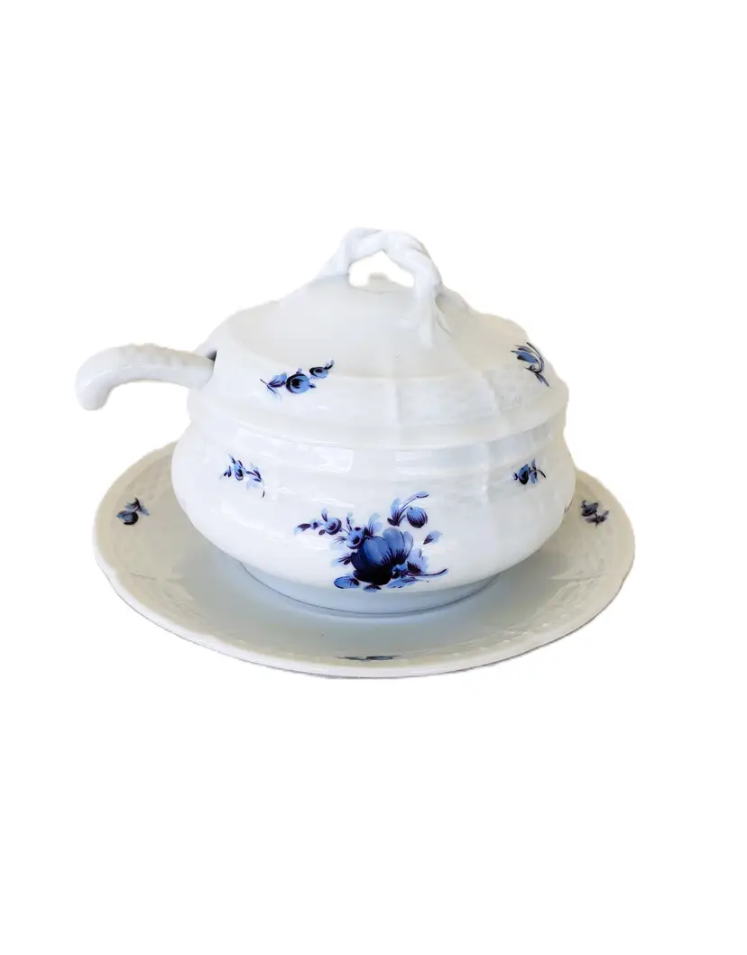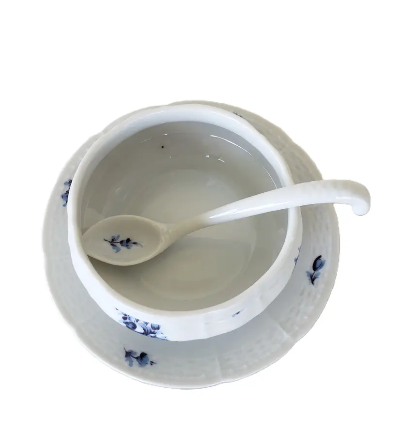This rare Nymphenburg marmalade dish is absolutely beautiful. It is white with blue rose buds and other blue flowers. The bowl is attached to the plate. Most of the time if you can find these, the spoons are missing. This one has the spoon. Each piece is hand painted and the artist's initials are on the bottom. This piece is in pristine condition. There is a small dot on the inside that is due to the manufacturing process. The dish looks like it has never been used. There are no stains, chips, cracks, crazing.