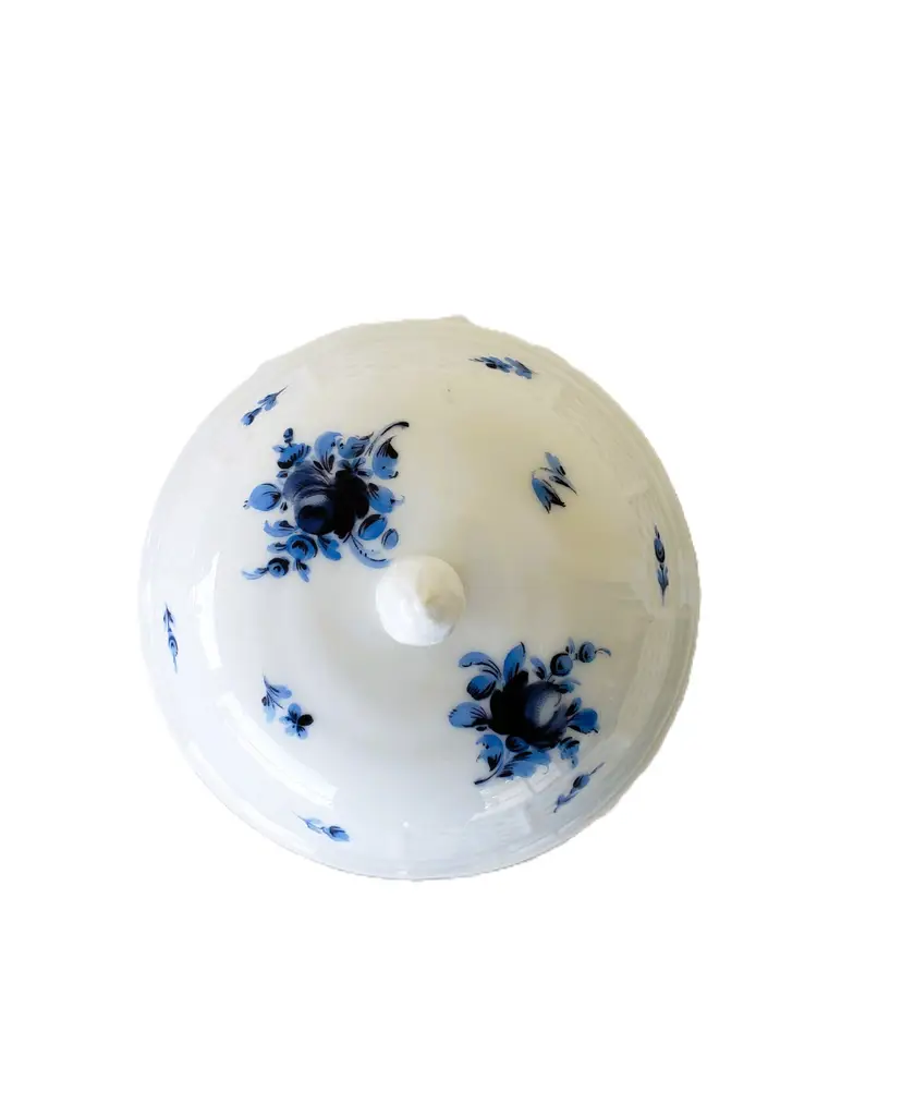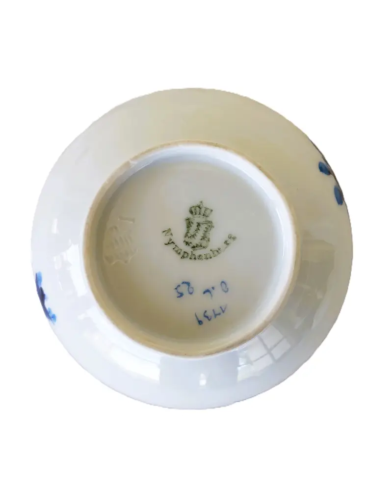 This is a gorgeous sugar bowl from Nymphenberg in Western Germany. It is white with blue rose buds and other blue flowers. The piece is hand painted with the artist's initials on the bottom. The sugar bowl is in pristine condition. It doesn't look like it has been used. There are no chips, cracks, crazing, or stains. This dainty sugar bowl is 3 1/2 inches across and just over 2 inches tall without the lid on.