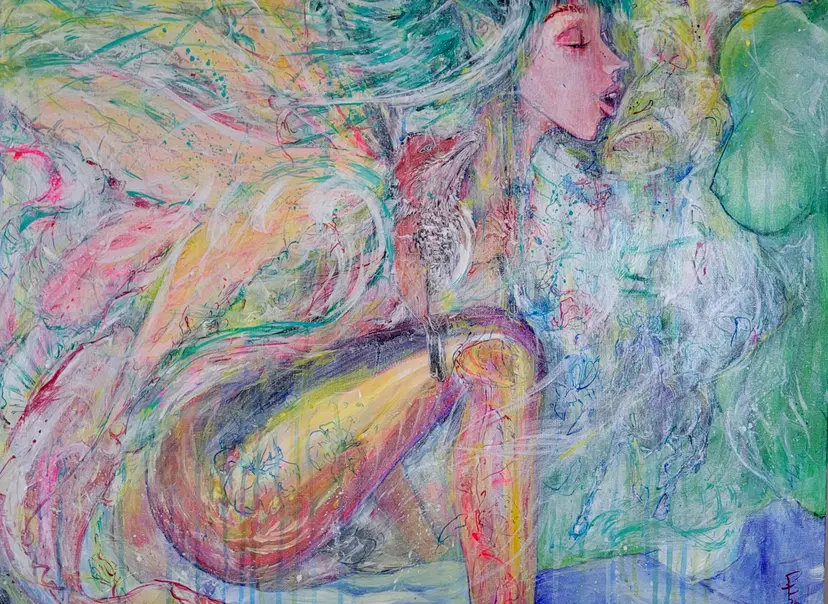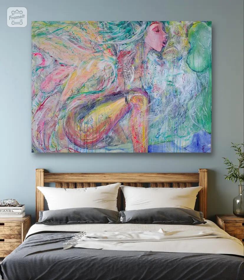 Acrylic on canvas painting by Christina Martine. 31.5 x 24 in. A pastel dreamscape featuring playful fairies in a sensual embrace. Hidden animals can be found all throughout the painting. Christina Martine painted this piece to capture the essence of a tantric union and power animal exchange. Peaceful, luxurious, inspiring, suitable for a bedroom. A rare find.