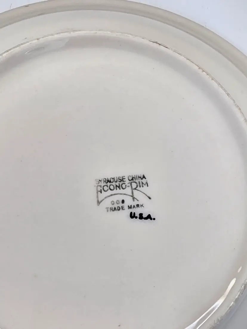 The Webster pattern was patented in May 1938 by D. Bourne and was available as both fine china and commercial china. The Webster fine china was produced from 1941 - 1966 (excluding the WWII years). The date code on this particular piece (CC8 ) indicates that it was manufactured in August 1948.