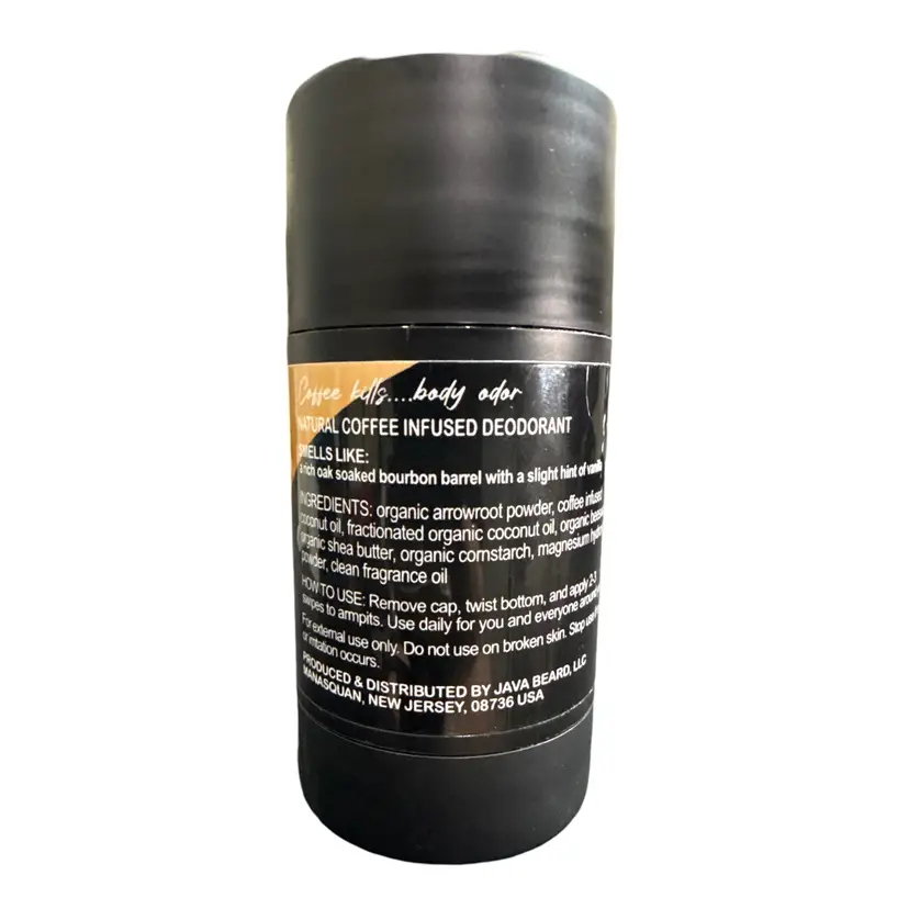 Oak Barrel Bourbon - COFFEE INFUSED DEODORANT SMELLS LIKE: a white oak bourbon soaked barrel with a slight hint of vanilla. CONTAINS ZERO: ALUMINUM, PARABENS, PHTHALATES, SULFATES, OR DYES Introducing our revolutionary coffee-infused natural deodorant, meticulously crafted to provide unparalleled odor control while prioritizing your health and wellness. What sets our deodorant apart is the transformative power of coffee oil, an exceptional ingredient known for its remarkable ability to eliminate body odor without relying on harmful chemicals. Coffee oil, with its potent antioxidant properties, not only enhances skin health by combating free radicals but also acts as a formidable odor eliminator when incorporated into our deodorant. By harnessing the benefits of this unique ingredient, we have created a deodorant that goes beyond conventional solutions, providing a truly exceptional and natural odor-controlling experience. As dedicated parents to triplet sons, we intimately understand the significance of using safe and natural products. That's why we developed this deodorant specifically for our own family. We wanted a reliable solution that would safeguard our sons' delicate skin during their active days without exposing them to harsh chemicals. Our gentle yet powerful natural deodorant effectively curbs odor throughout the day, ensuring you feel fresh and confident in any situation. Its enduring formula provides all-day protection, allowing you to embrace each moment without worries. With meticulously chosen natural ingredients and the infusion of coffee oil, our deodorant presents the ideal choice for those seeking a wholesome and efficacious alternative for odor control and skin health. Bid farewell to harmful chemicals and welcome a deodorant that genuinely cares for your skin. Embrace the transformative power of nature with our coffee-infused natural deodorant, and experience a new level of freshness and vitality. Trust us to deliver a product that not only meets your expectations but exceeds them, revolutionizing your daily routine with the power of natural ingredients. INGREDIENTS: organic arrowroot powder, coffee infused coconut oil, fractionated organic coconut oil, organic beeswax, organic shea butter, cornstarch, magnesium hydroxide powder, fragrance oils HOW TO USE: Remove cap, twist bottom, and apply 2-3 swipes to armpits or anywhere the body that you are looking to decrease body odor. Use daily for you and everyone around you. Our deodorant can withstand outside temperature of up to 90 degrees. If you live in an area that exceeds this temperature, your deodorant that may arrive melted. If that happens, place the deodorant in the refrigerator until it solidifies.