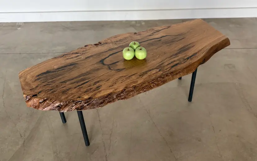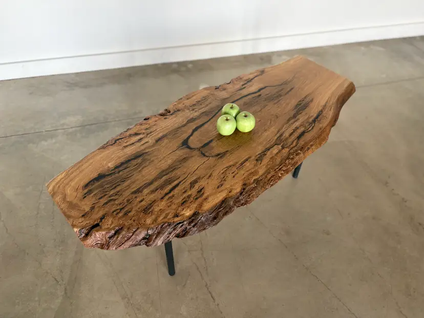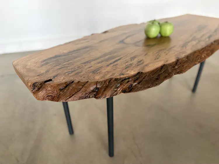 Oak Burl Coffee Table. Top is a solid live-edge oak burl slab, blackened steel legs. Dimensions: 48” long x 20” wide x 18” high Also available in other sizes and wood species. Contact us for custom work.