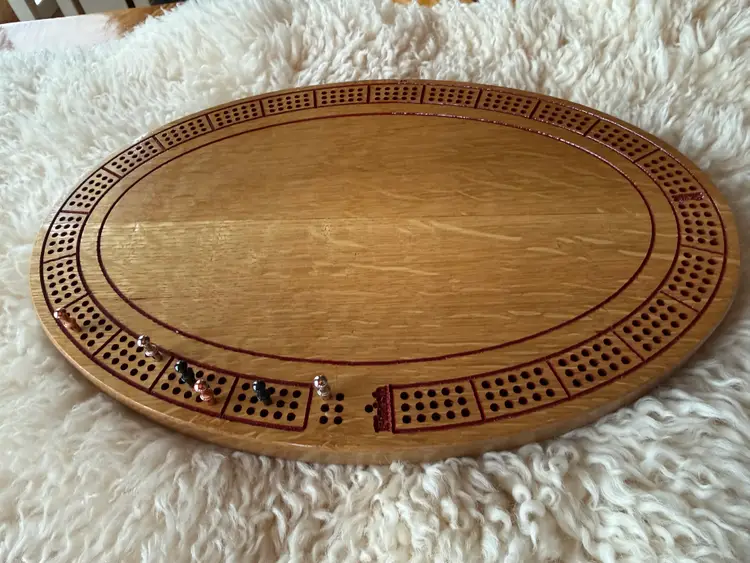This 14 × 9.5 inch oval oak cribbage board showcases my enjoyment of working with a wide range of materials and forms. The oak was thoughtfully shaped and finished to highlight its strength, grain, and timeless character. Designed to be both functional and comfortable to use, this board reflects my hands-on approach to woodworking and my focus on creating pieces that are simple, durable, and meant to be enjoyed for years to come.