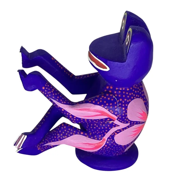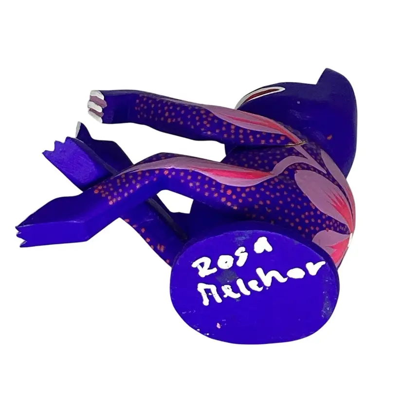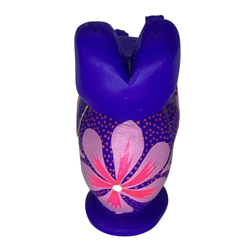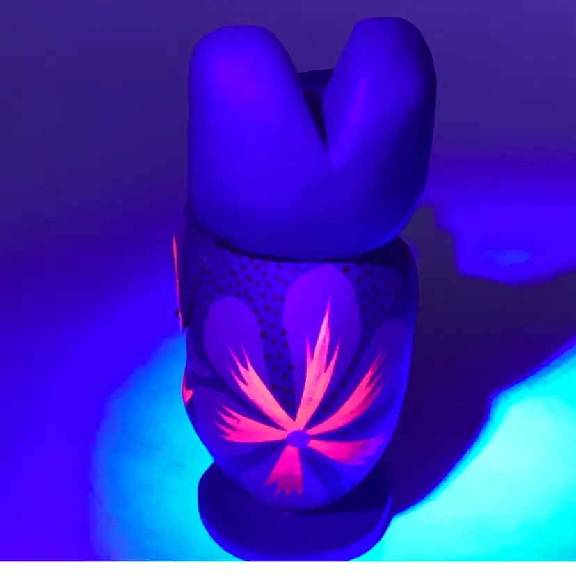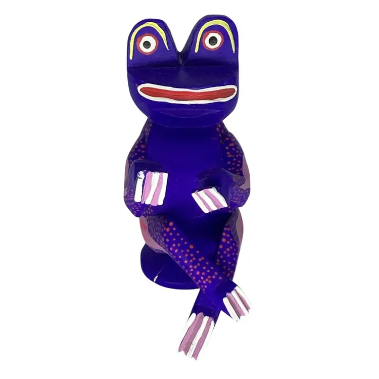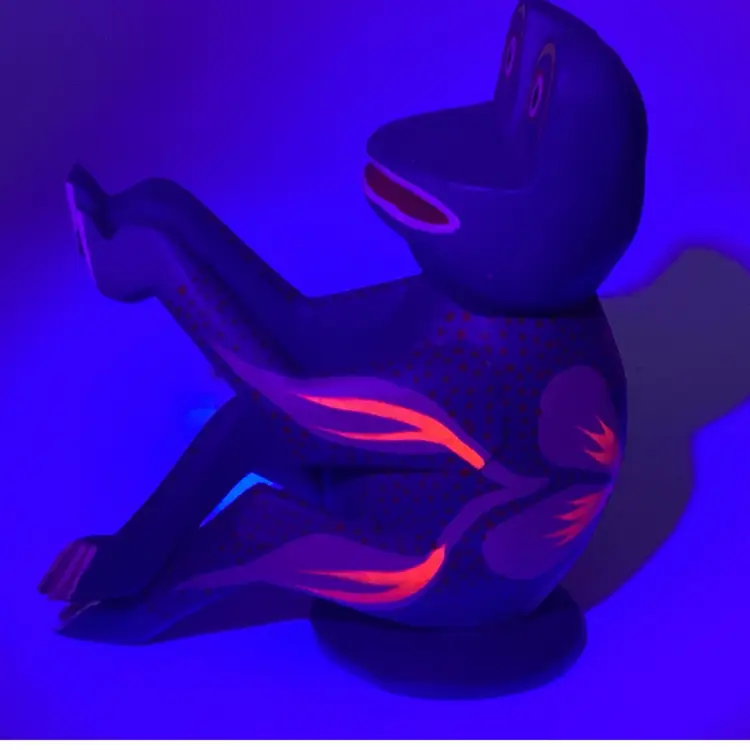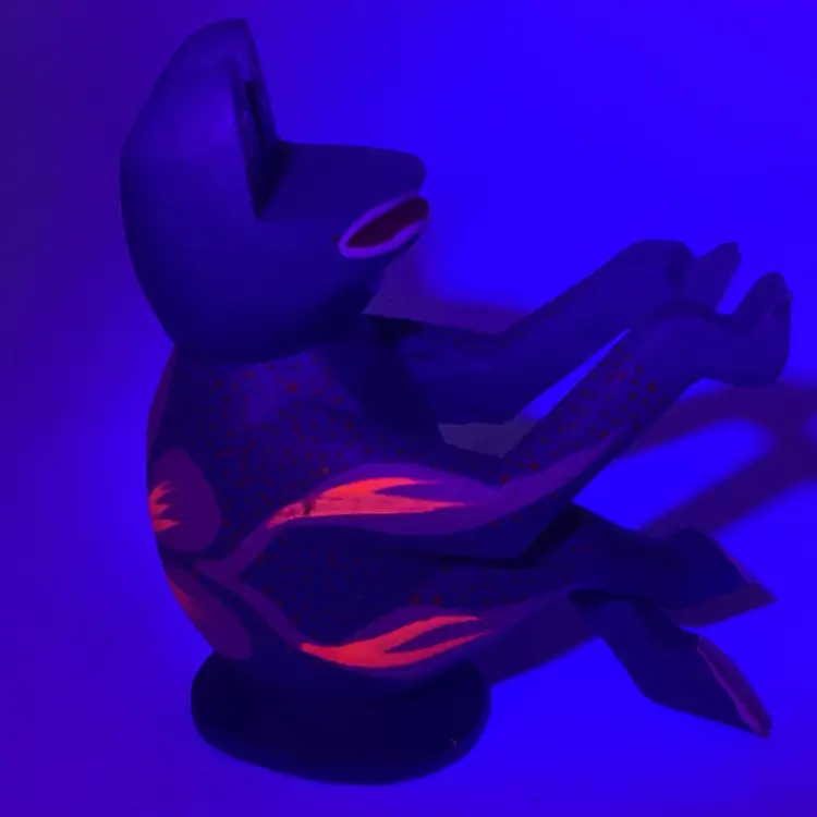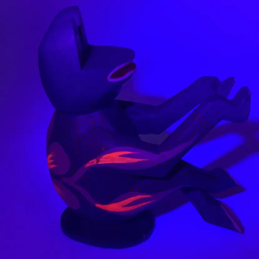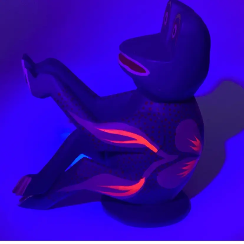 Measures 4 inches tall by 3 1/2 inches long front to back Painted in fluorescent paint so the parts glow beautifully under a UV or black light Signed on the bottom by the artist Some of these originally held books, but I see no signs that he’s missing anything in his hands The left arm is a little wiggly