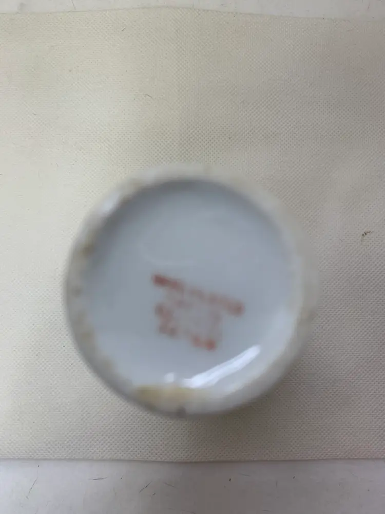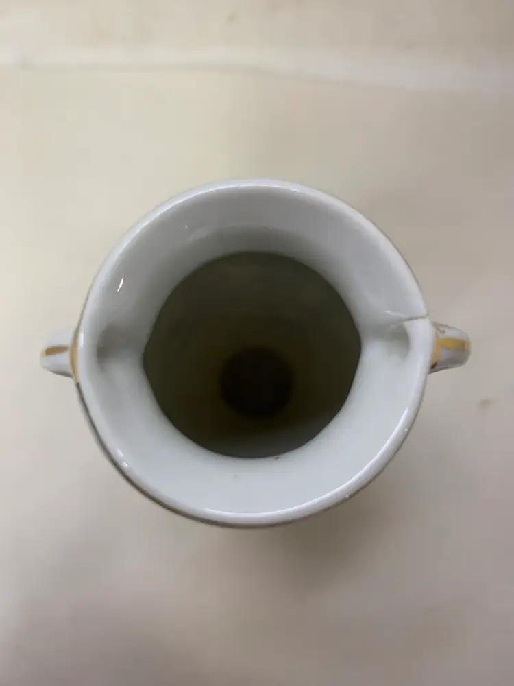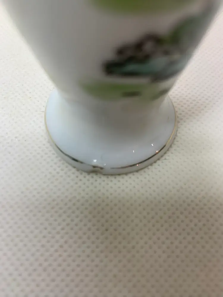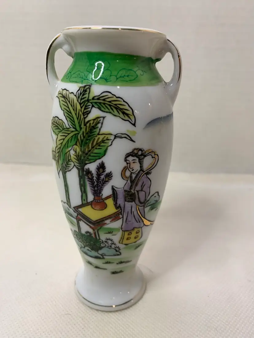 Hand painted made in occupied Japan. There is a chip on the bottom, see picture, and there looks to be a crack on rim by one handle but I think it’s just a flaw from when it was made. It’s a darling little vase. 5 1/8 inches tall and 2 inches wide.
