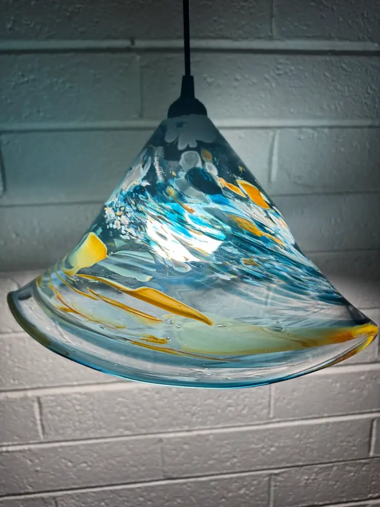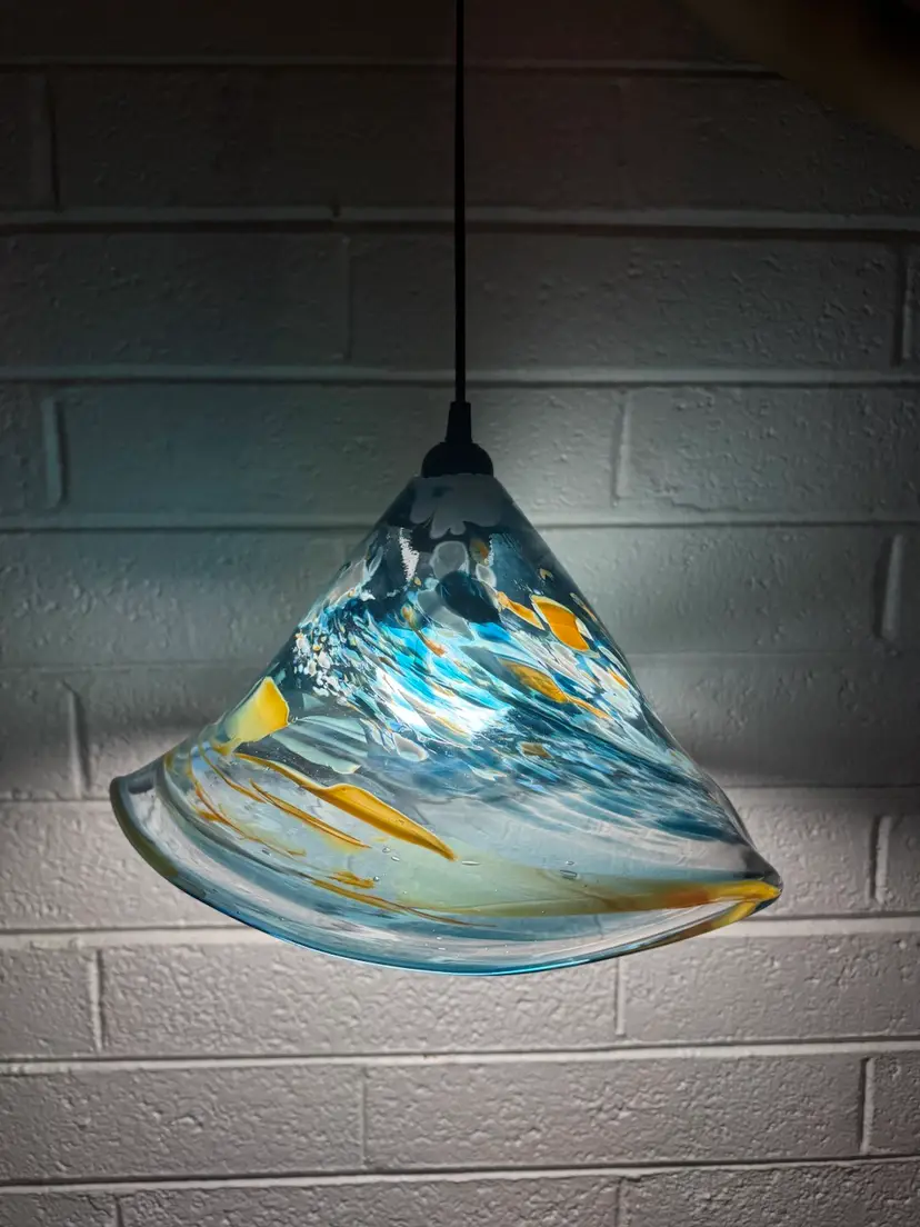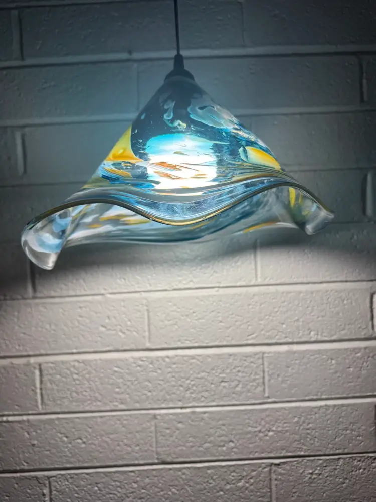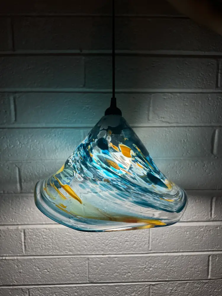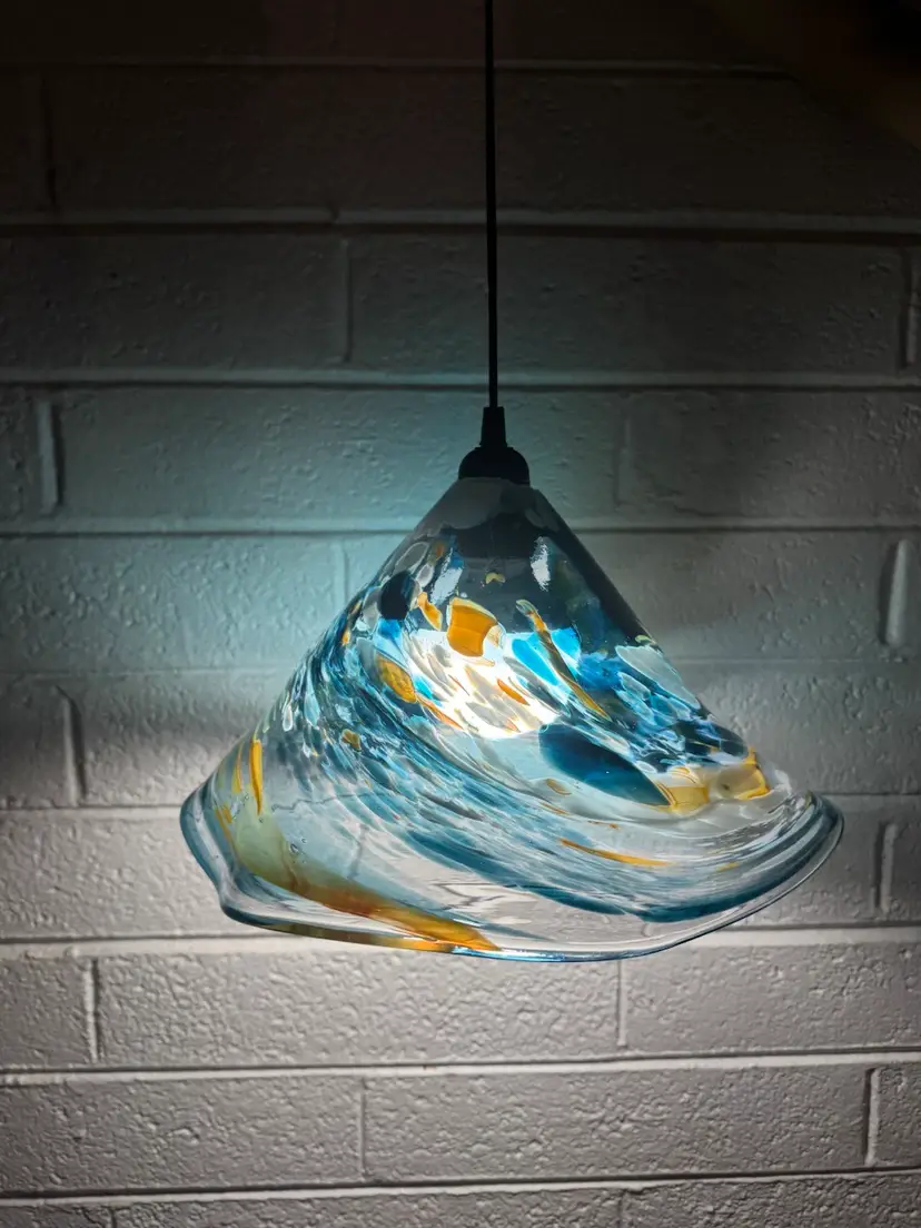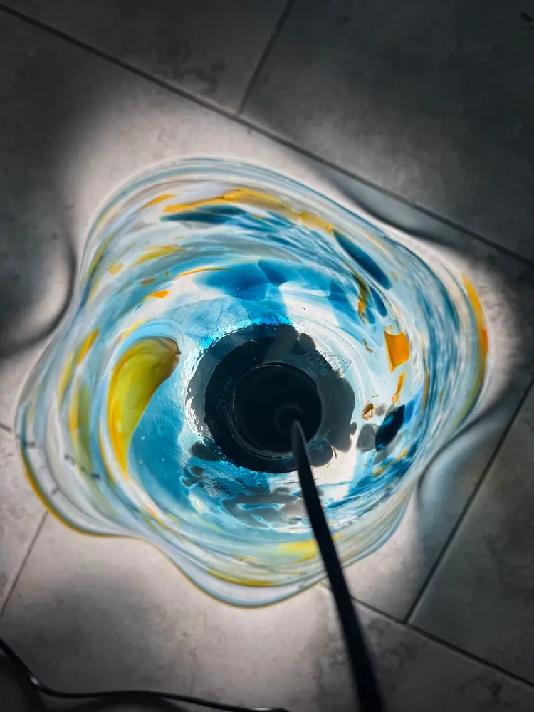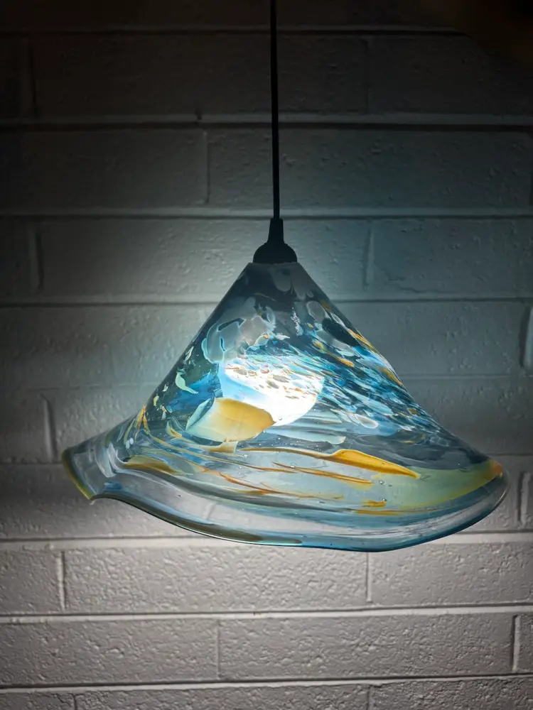 Made with crushed recycled glass material. Hand blown. Dimensions: 8” tall and diameter 12”